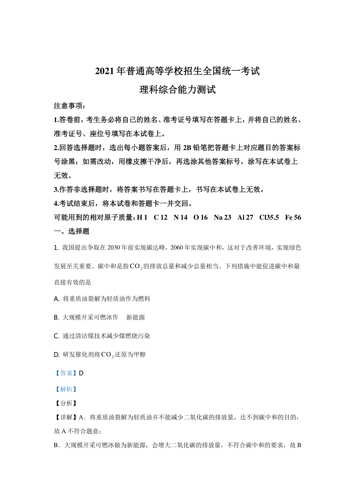 一、2021年高考全国乙卷化学试题(逐题解析word版)【适用地区:河南、安徽、江西、山西、陕西、黑龙江