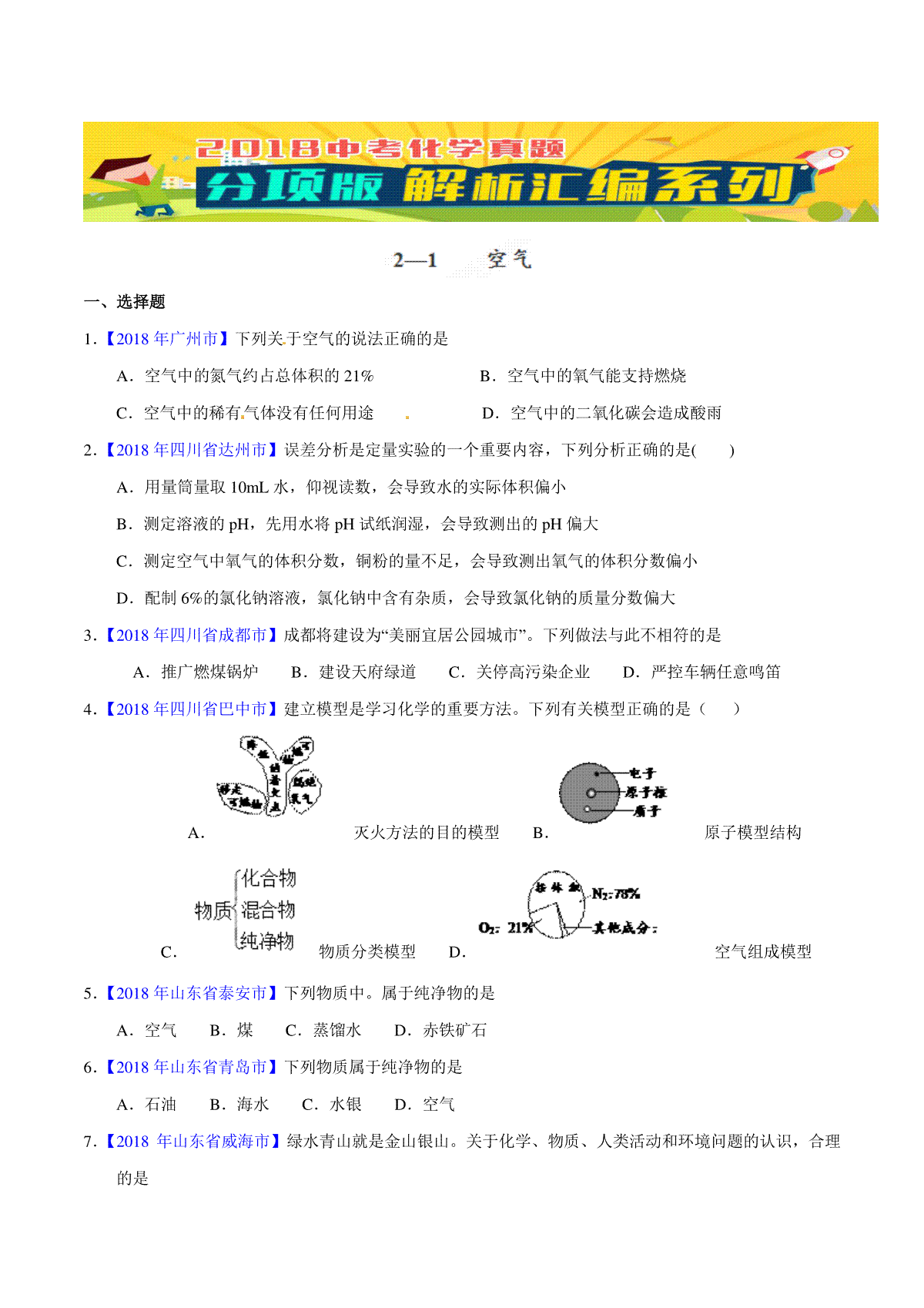 一、专题2.1 空气(第01期)-2018年中考化学试题分项版解析汇编(原卷版)