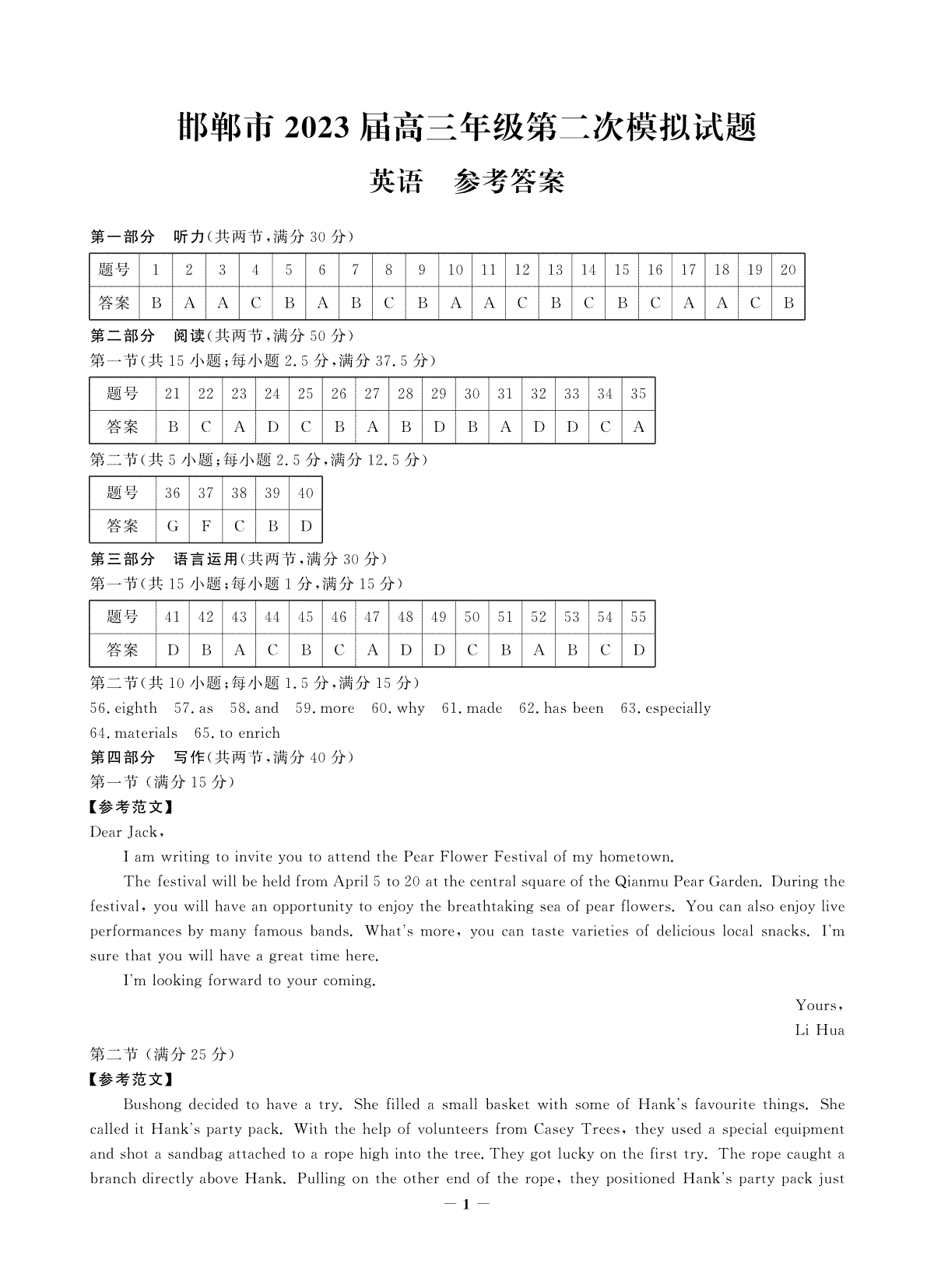 下载2023河北邯郸高三二模英语答案PDF格式或doc