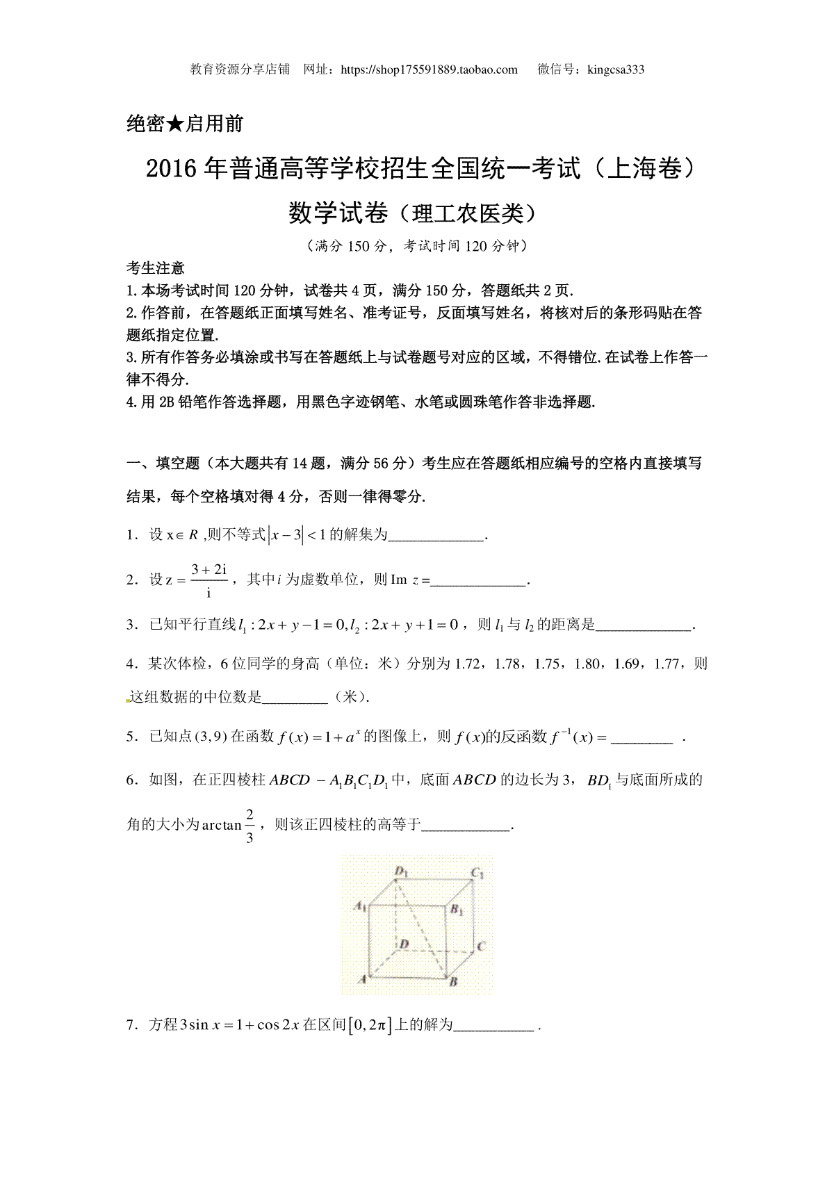 一、2016年上海高考数学真题(理科)试卷(原卷版)