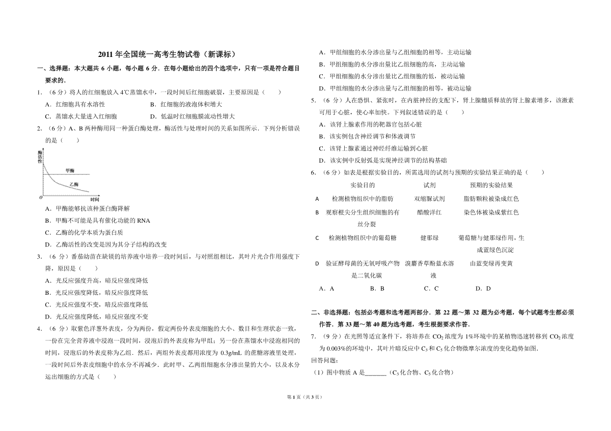 一、2011年全国统一高考生物试卷(新课标)(原卷版)