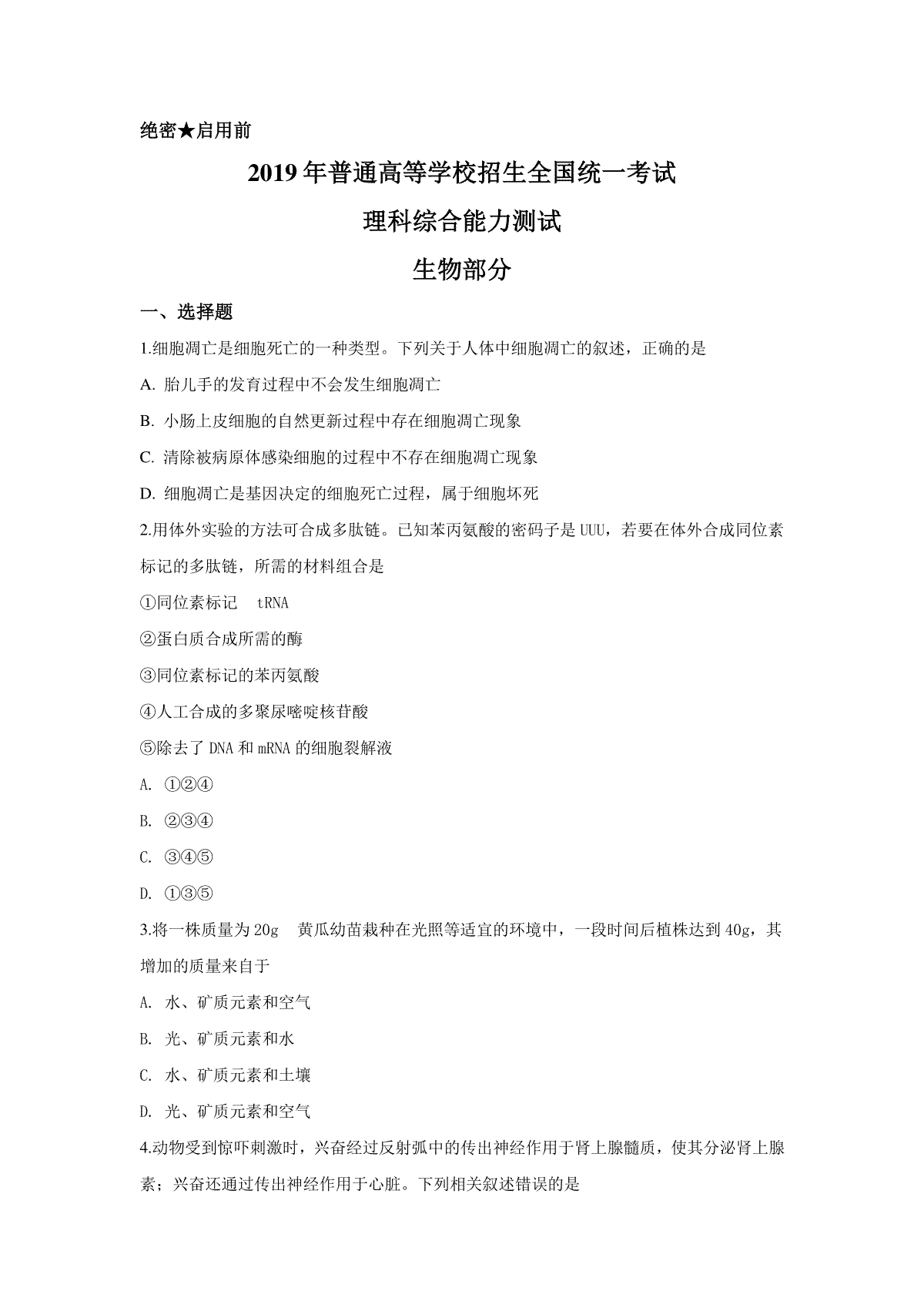 下载2019年广东高考生物(原卷版)PDF格式或doc