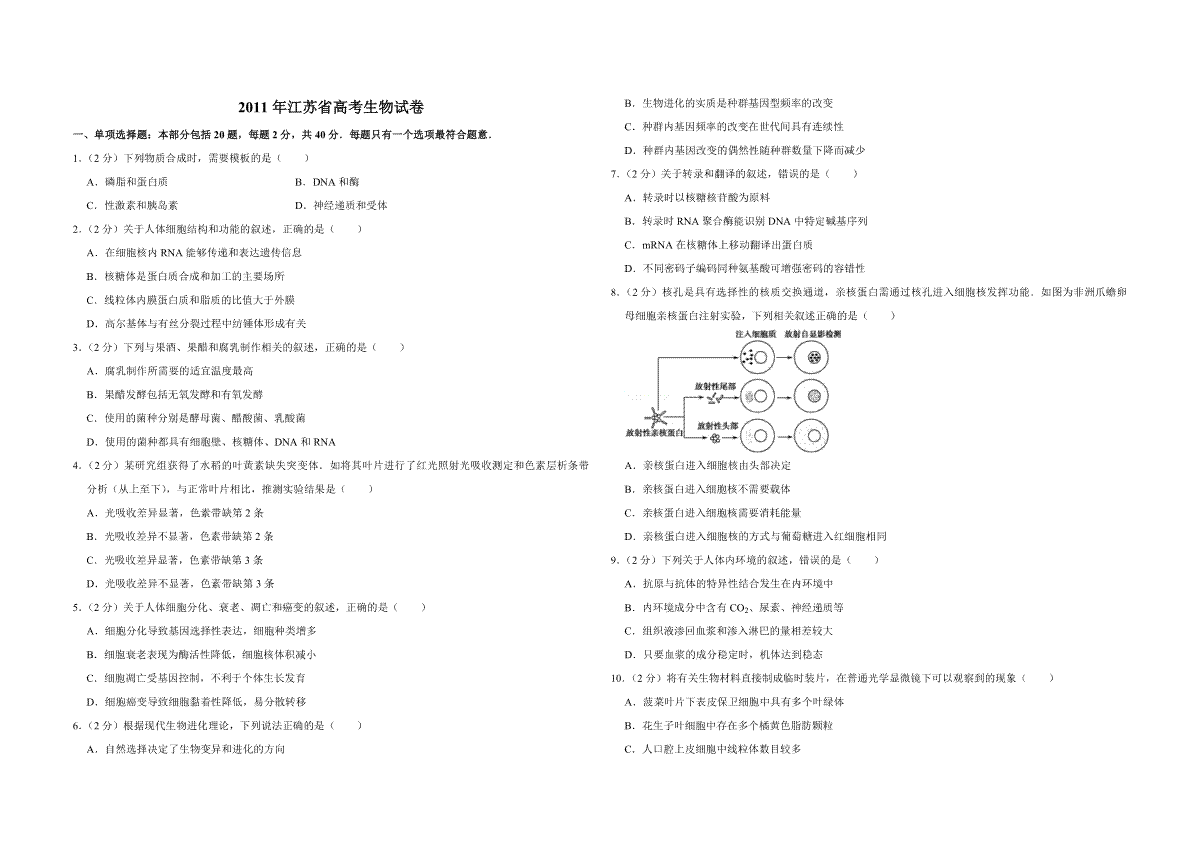 一、2011年江苏省高考生物试卷