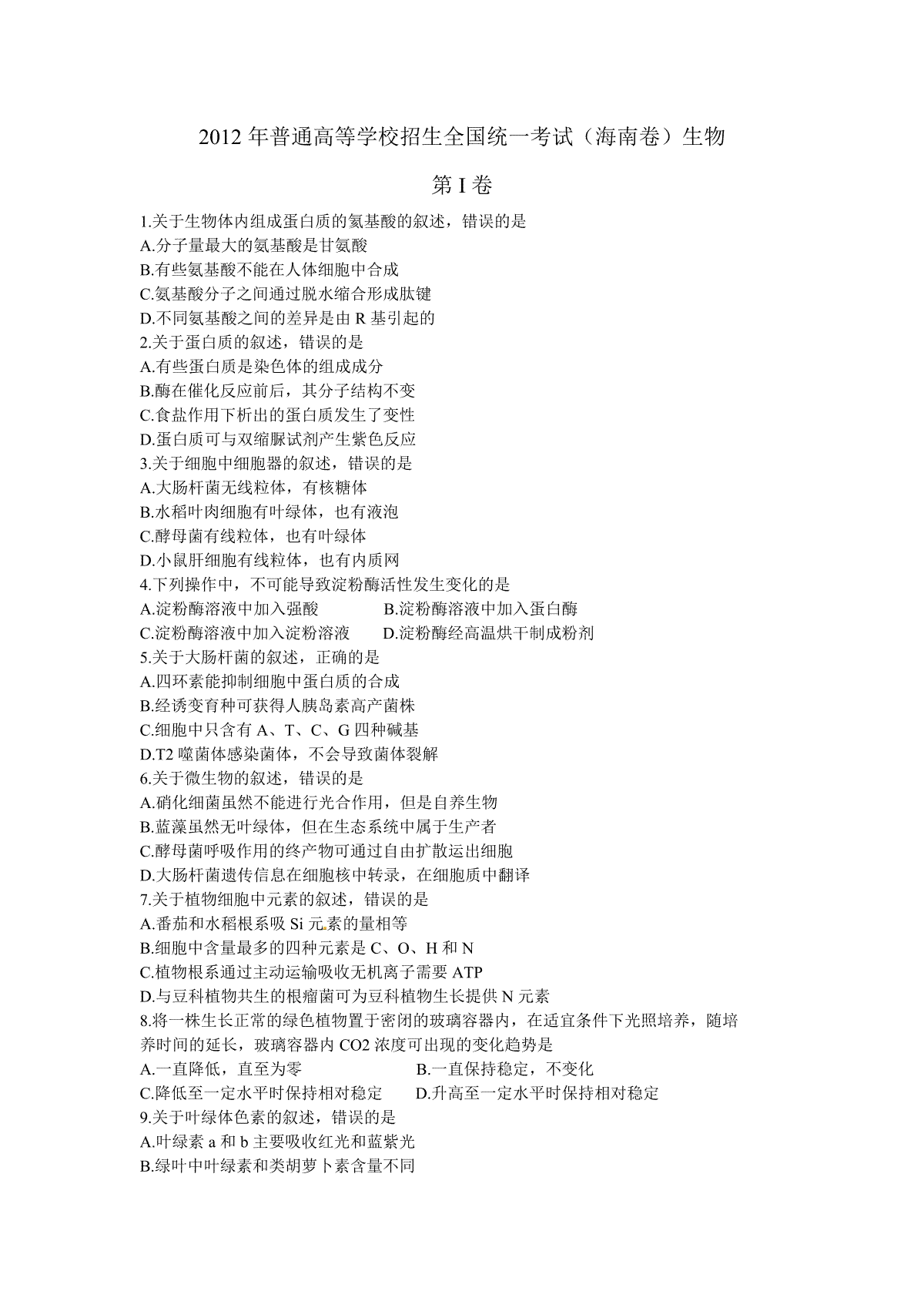 如果你想下载2012年高考海南卷生物试题及答案DOC或PDF版,请点击本文末链接!