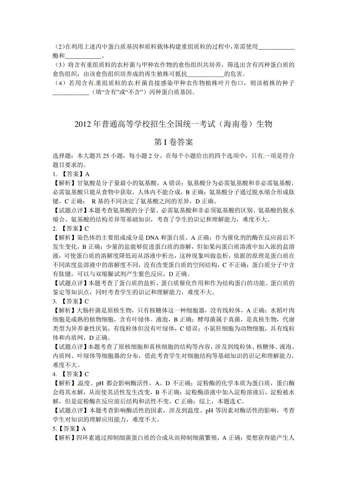 如果你想下载2012年高考海南卷生物试题及答案DOC或PDF版,请点击本文末链接!