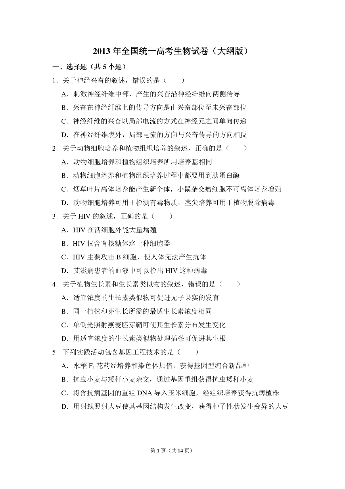 一、2013年全国统一高考生物试卷(大纲版)(含解析版)
