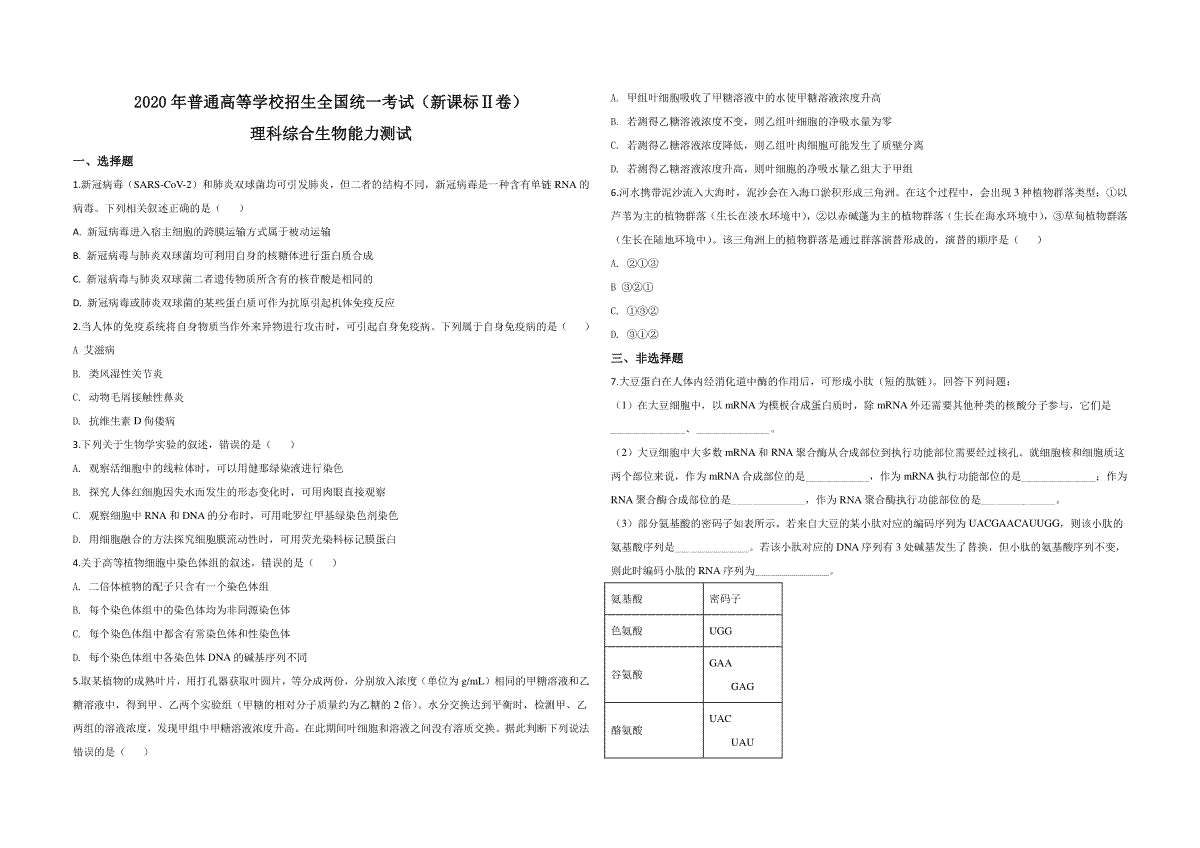 一、2020年全国统一高考生物试卷(新课标ⅱ)(原卷版)