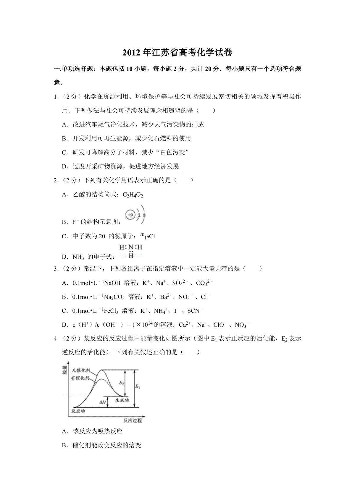 下载2012年江苏省高考化学试卷 PDF格式或doc