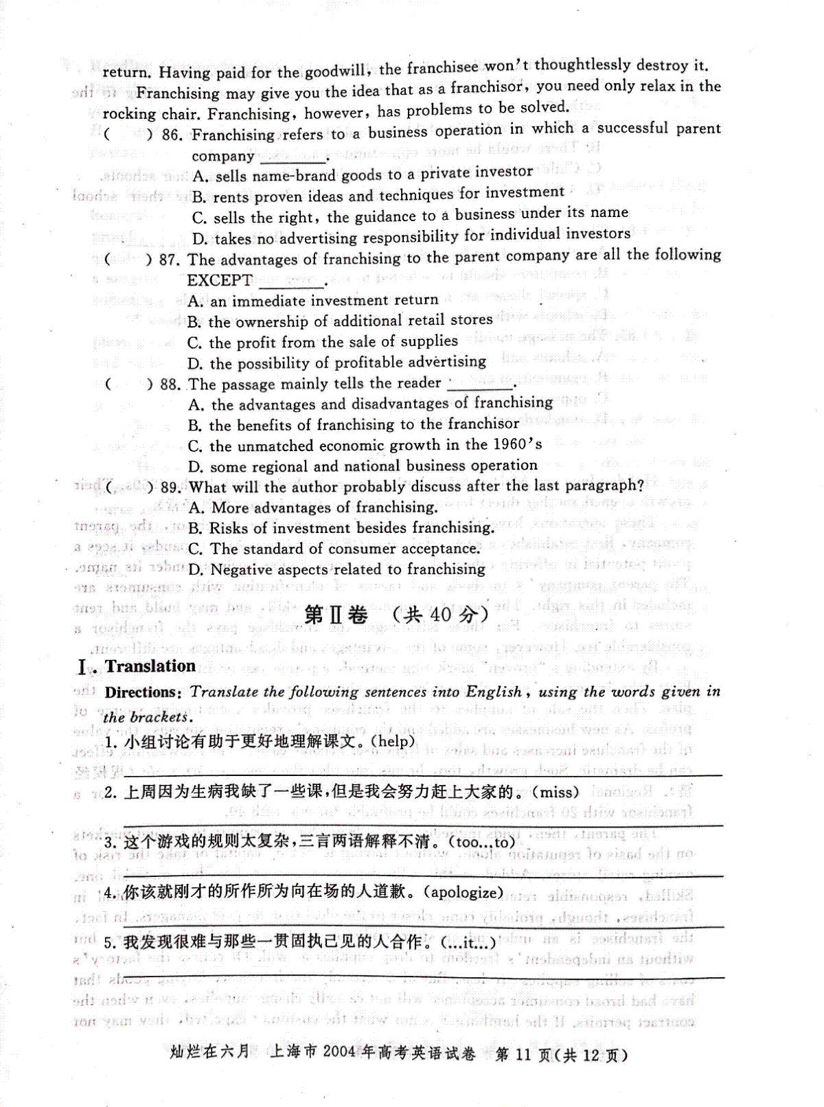 2004年上海高考英语真题试卷(图片版)于近期开考,本次考试对考生对知识的掌握参考价值大,为了方便大家复习掌握错题!小编在下文为大家准备了2004年上海高考英语真题试卷(图片版)试卷及答案解析详情,仅供考生参考。