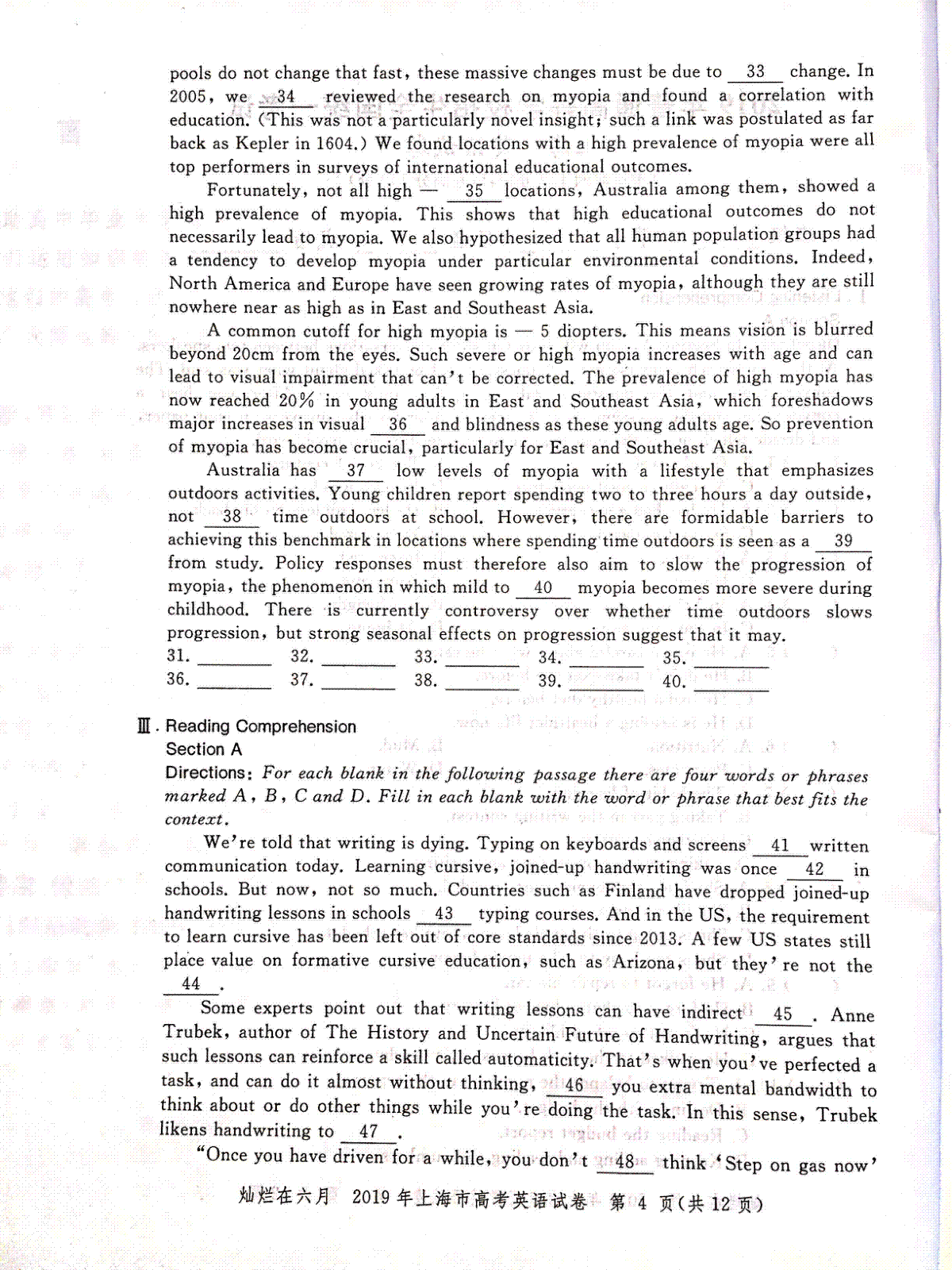 2019年上海高考英语真题试卷(图片版)于近期开考,本次考试对考生对知识的掌握参考价值大,为了方便大家复习掌握错题!小编在下文为大家准备了2019年上海高考英语真题试卷(图片版)试卷及答案解析详情,仅供考生参考。