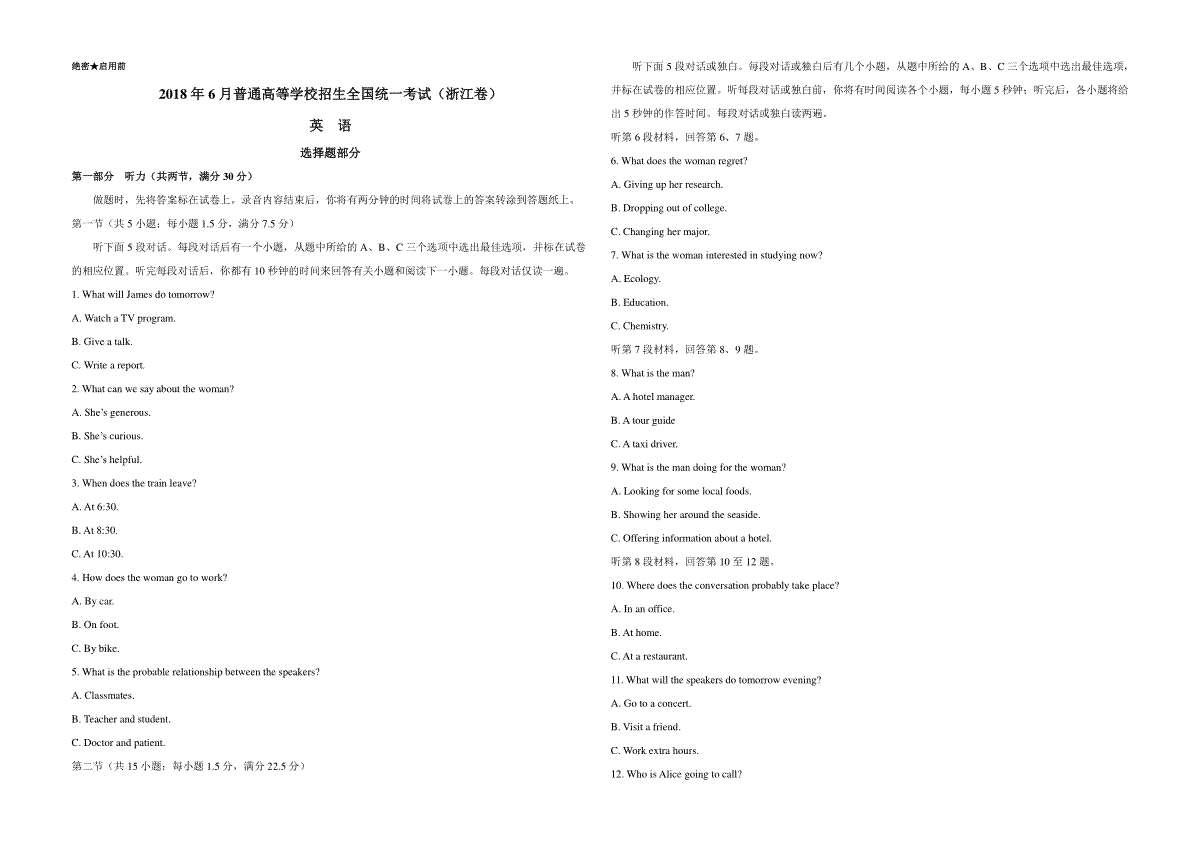 一、2018年浙江省高考英语【6月】(原卷版)