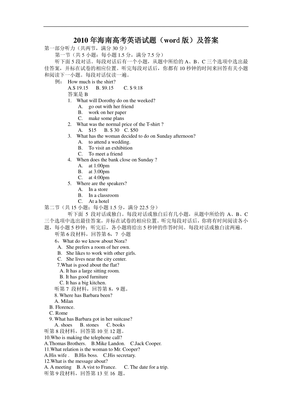 下载2010年海南高考英语(原卷版)PDF格式或doc