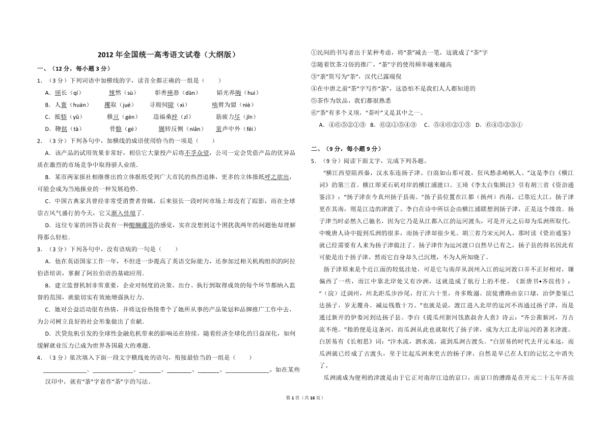 一、2012年全国统一高考语文试卷(大纲版)(含解析版)