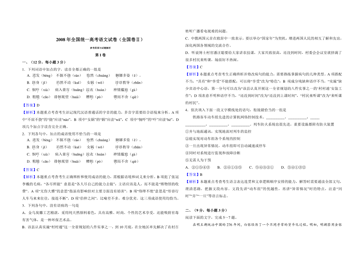 一、2008年全国统一高考语文试卷(全国卷ⅱ)(含解析版)