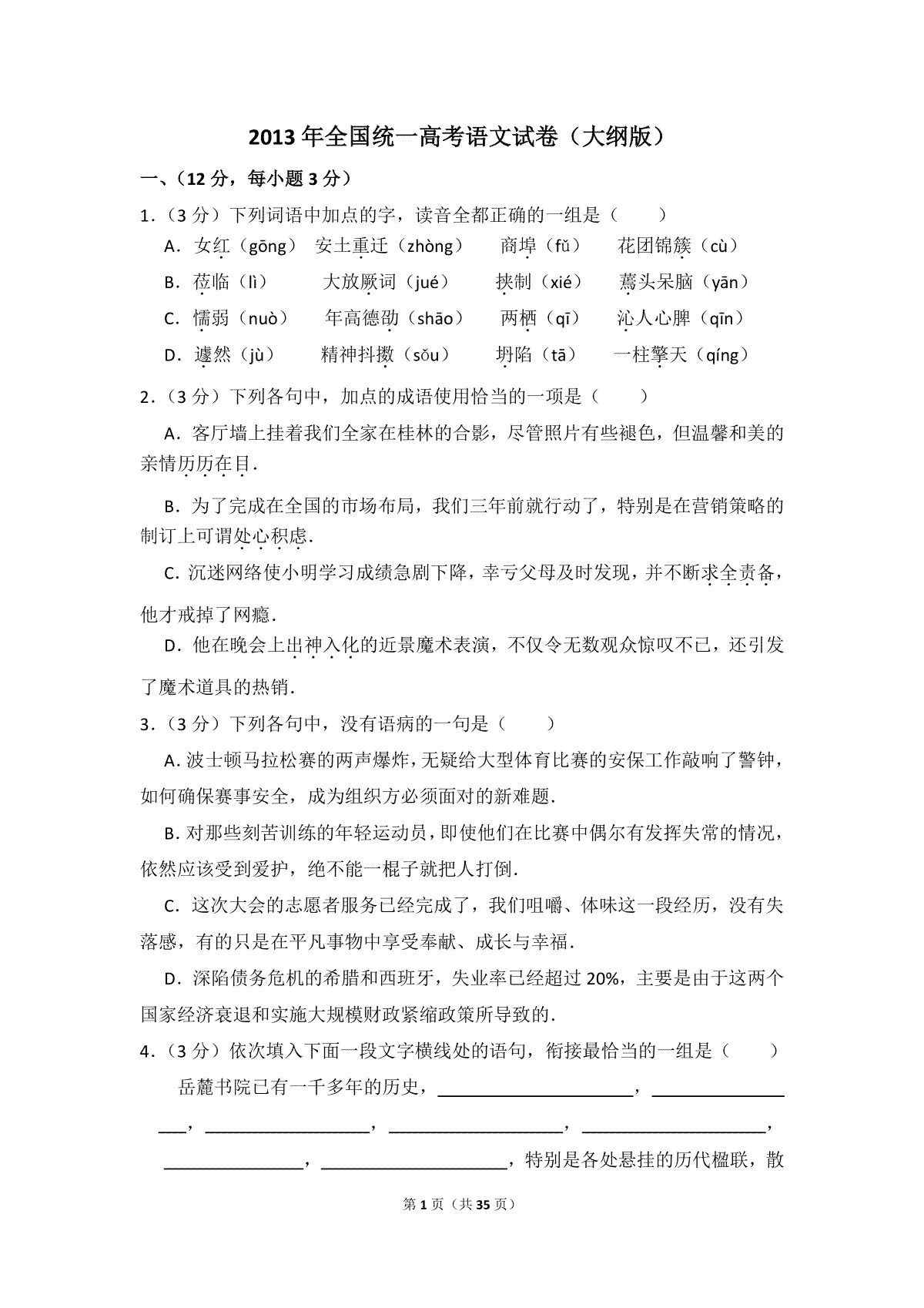 一、2013年全国统一高考语文试卷(大纲版)(含解析版)