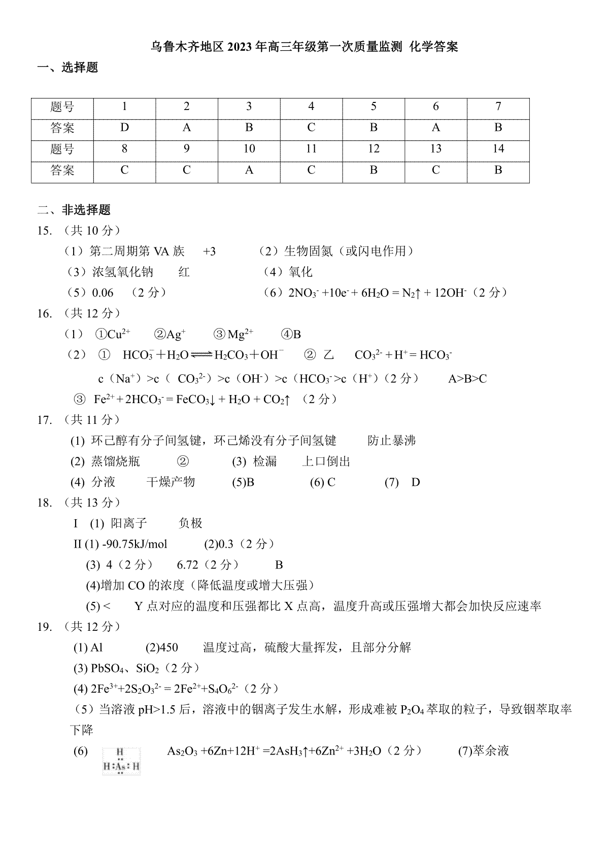 一、2023届新疆乌鲁木齐地区高三第一次质量监测化学答案