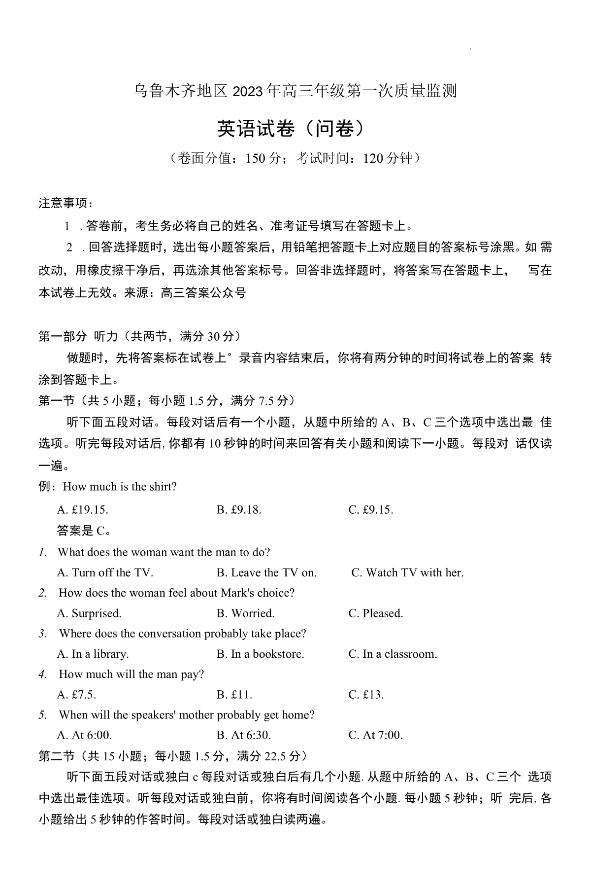 一、2023乌鲁木齐高三年级一模考试英语试题