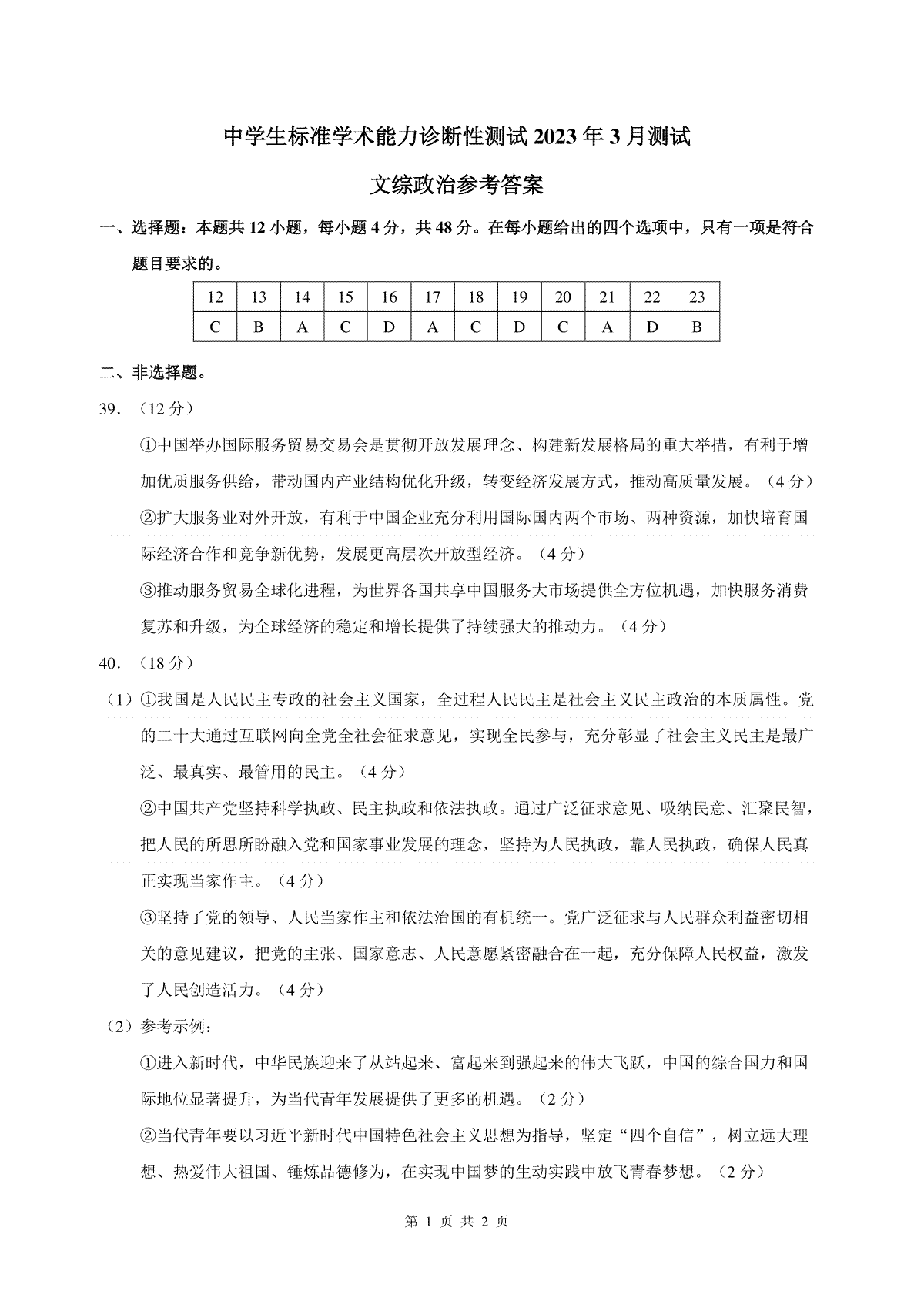 一、THUSSAT2023年3月诊断性测试文科综合政治答案
