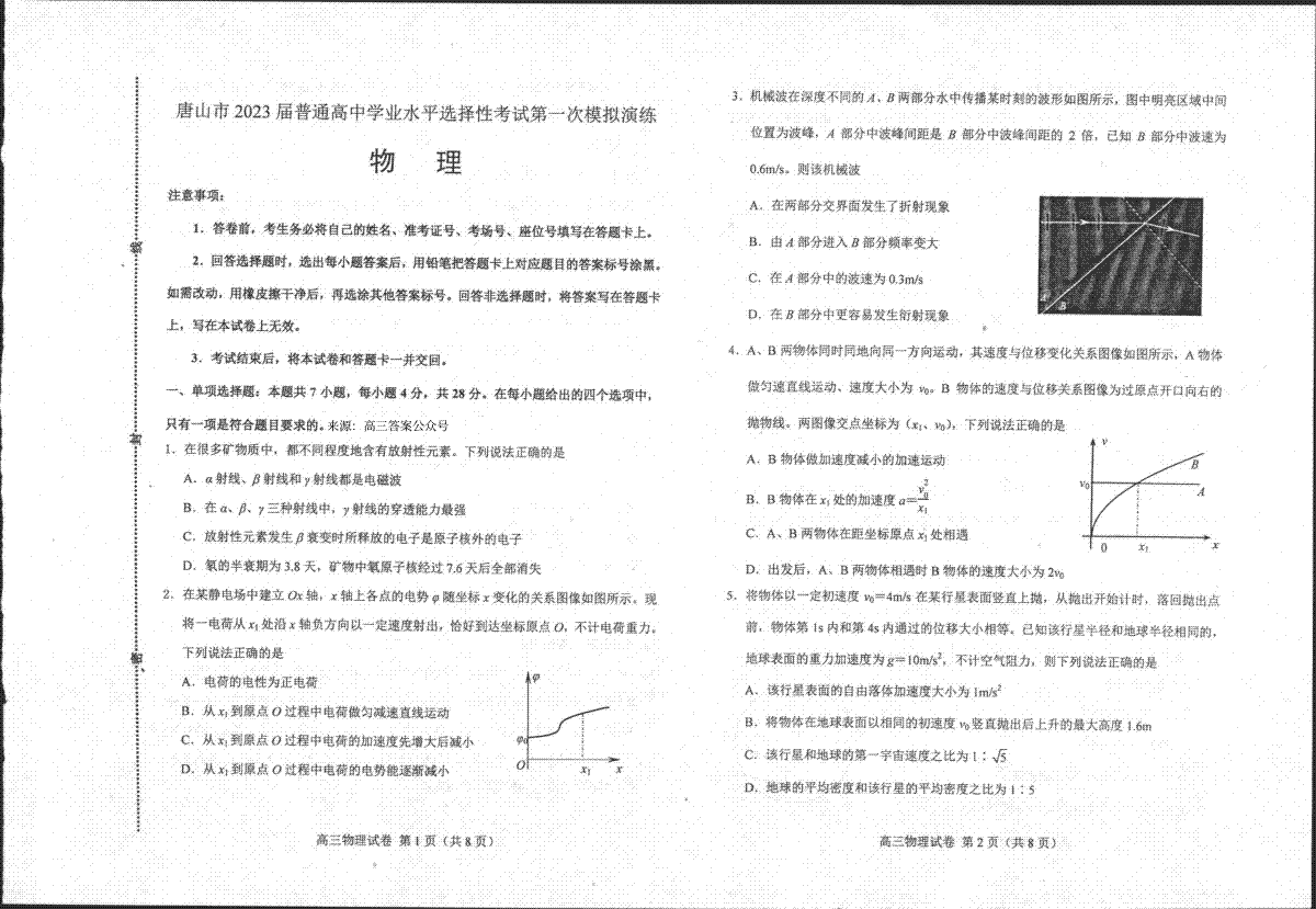 如果你想下载河北省唐山市2023届高三一模物理试题DOC或PDF版,请点击本文末链接!