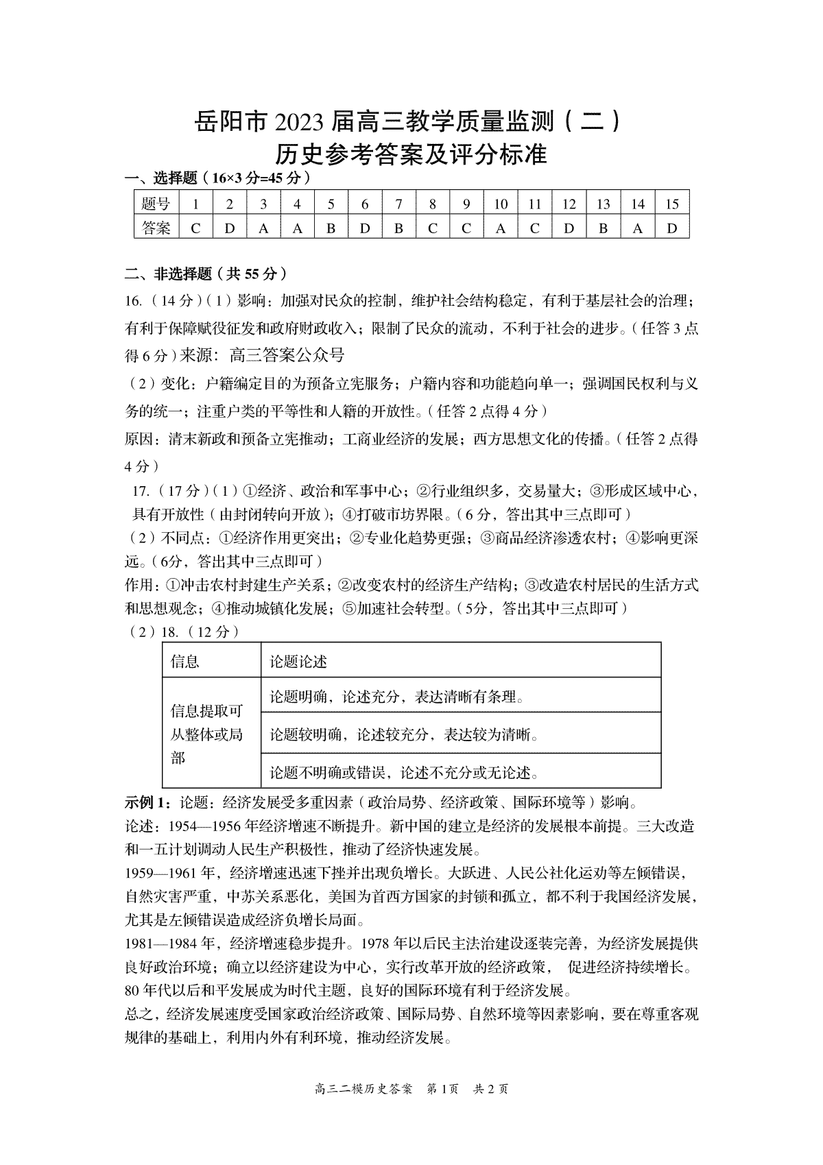 一、湖南省岳阳市2023 届高三教学质量监测(二)-岳阳二模高三历史答案