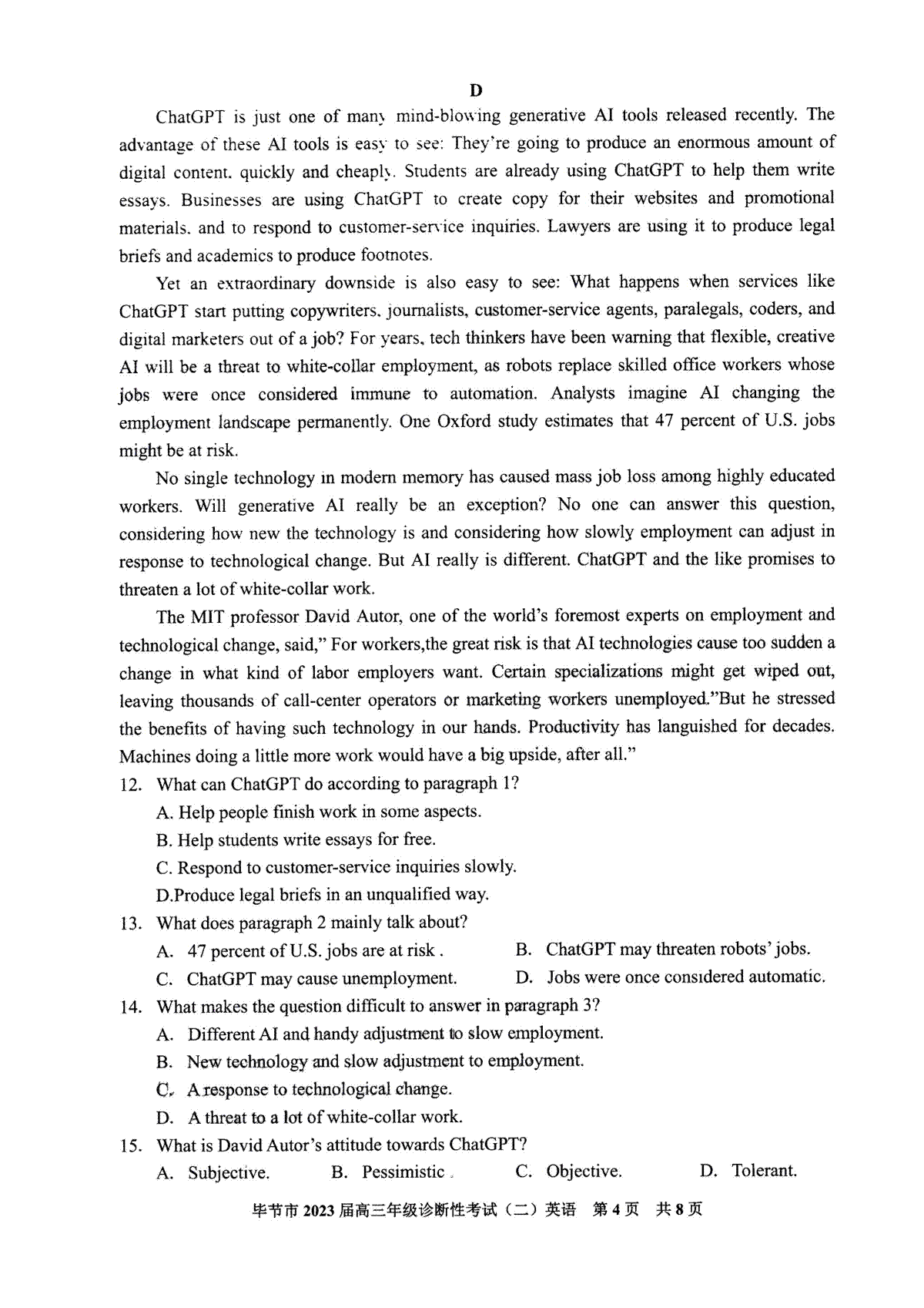 如果你想下载毕节市2023届高三年级诊断性考试(二)英语DOC或PDF版,请点击本文末链接!