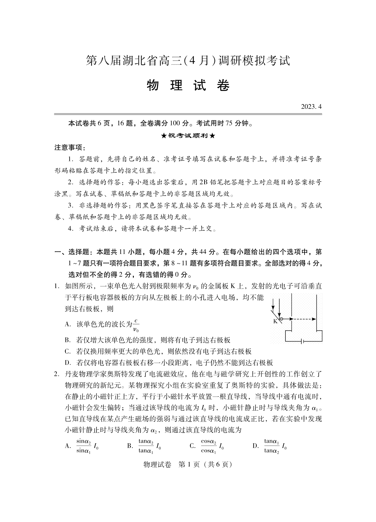 下载2023湖北四月调研(新高考)物理PDF格式或doc