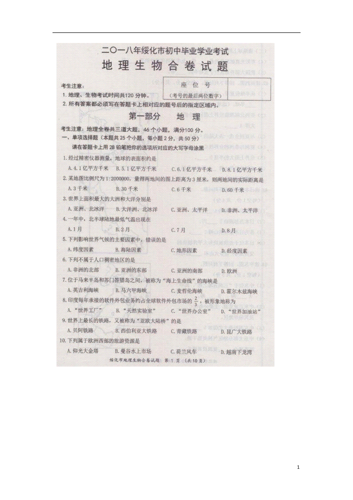 一、黑龙江省绥化市2018年中考地理真题试题(扫描版,含答案)
