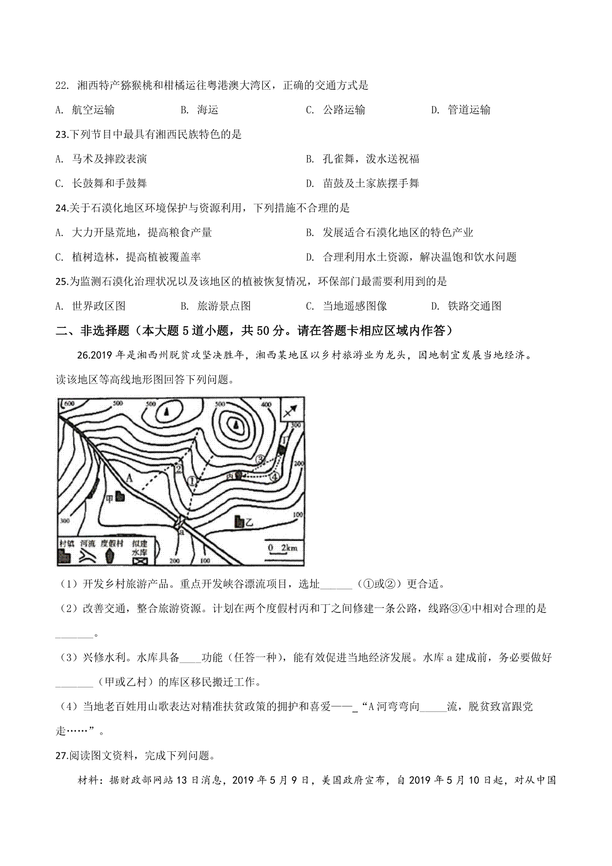 一、精品解析:湖南省湘西土家族苗族自治州2019年中考地理试题(原卷版)