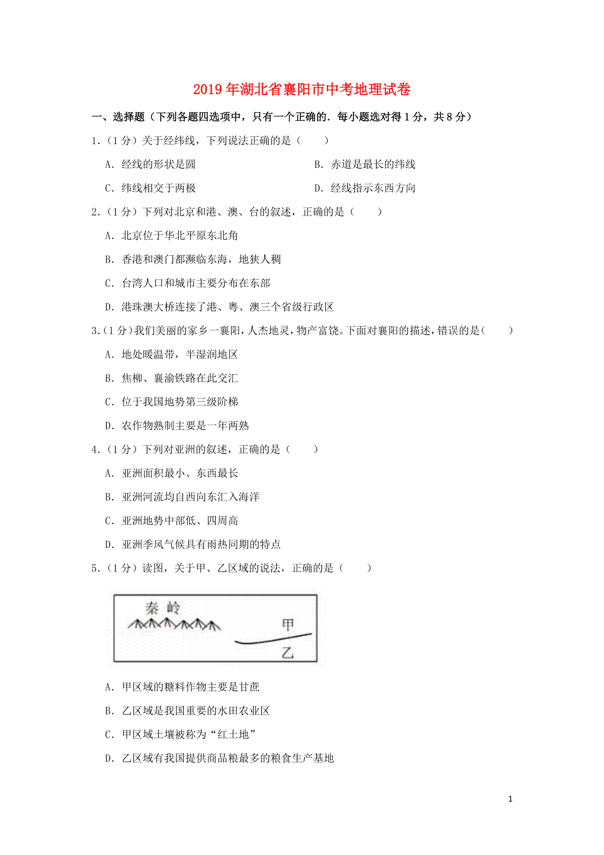 一、湖北省襄阳市2019年中考地理真题试题(含解析)新人教版