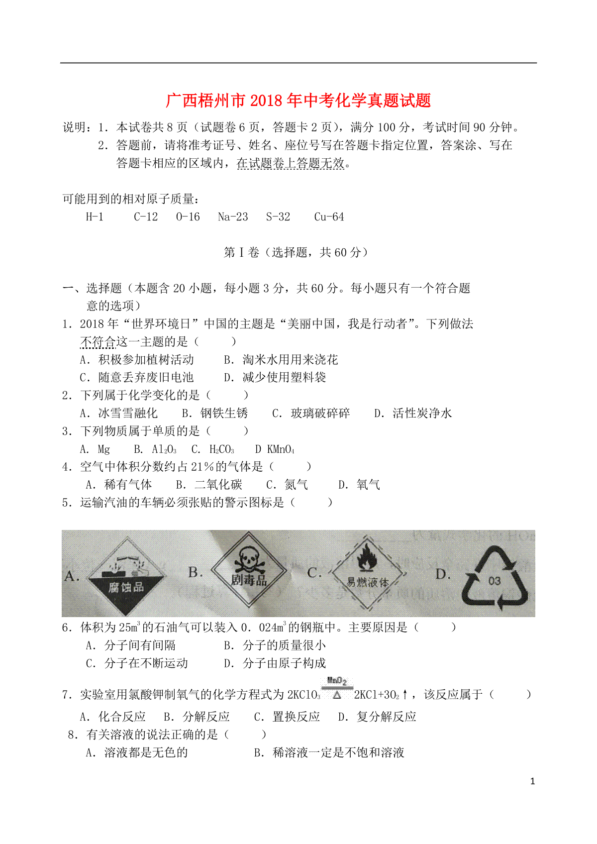 如果你想下载广西梧州市2018年中考化学真题试题(含答案)DOC或PDF版,请点击本文末链接!