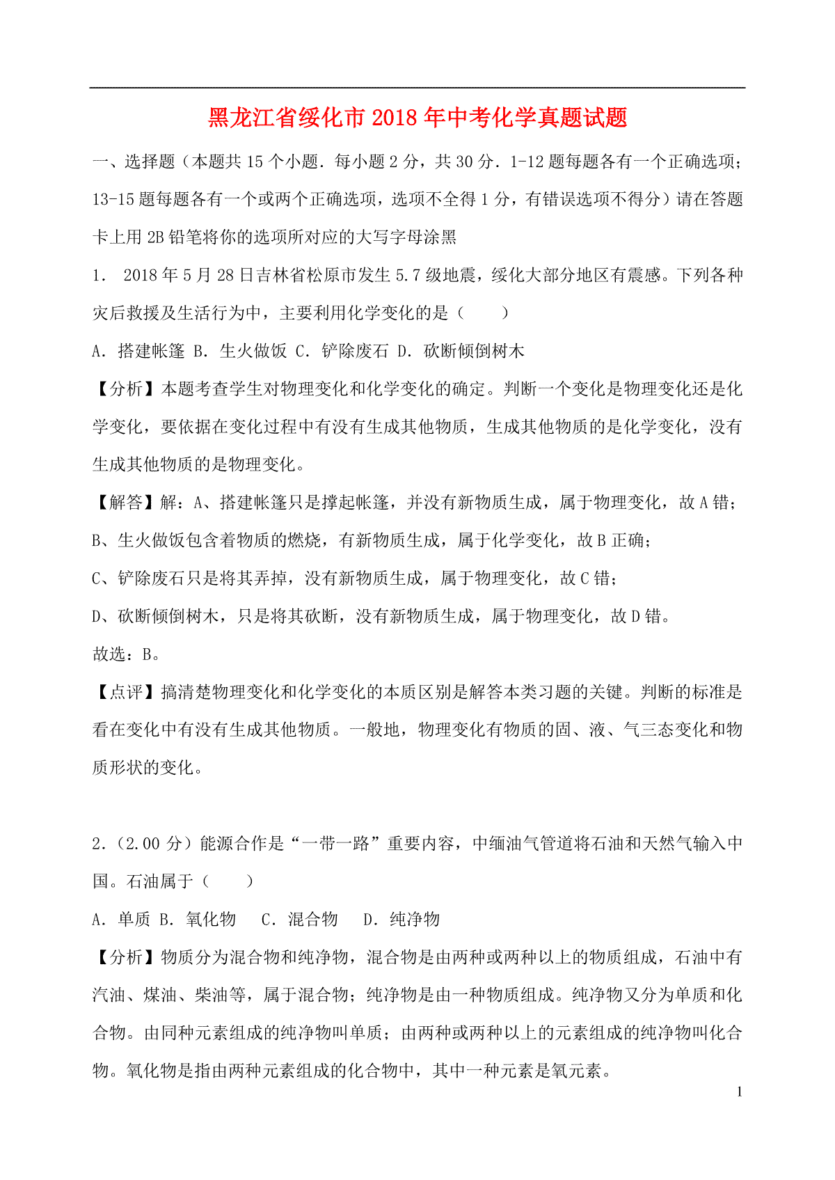 一、黑龙江省绥化市2018年中考化学真题试题(含解析)