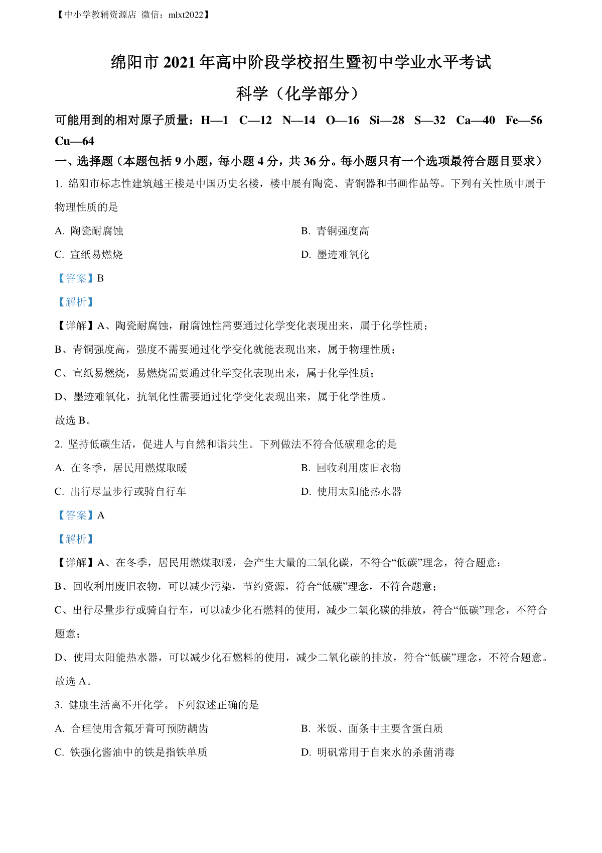 如果你想下载精品解析:2022年四川省绵阳市中考化学真题(解析版)DOC或PDF版,请点击本文末链接!