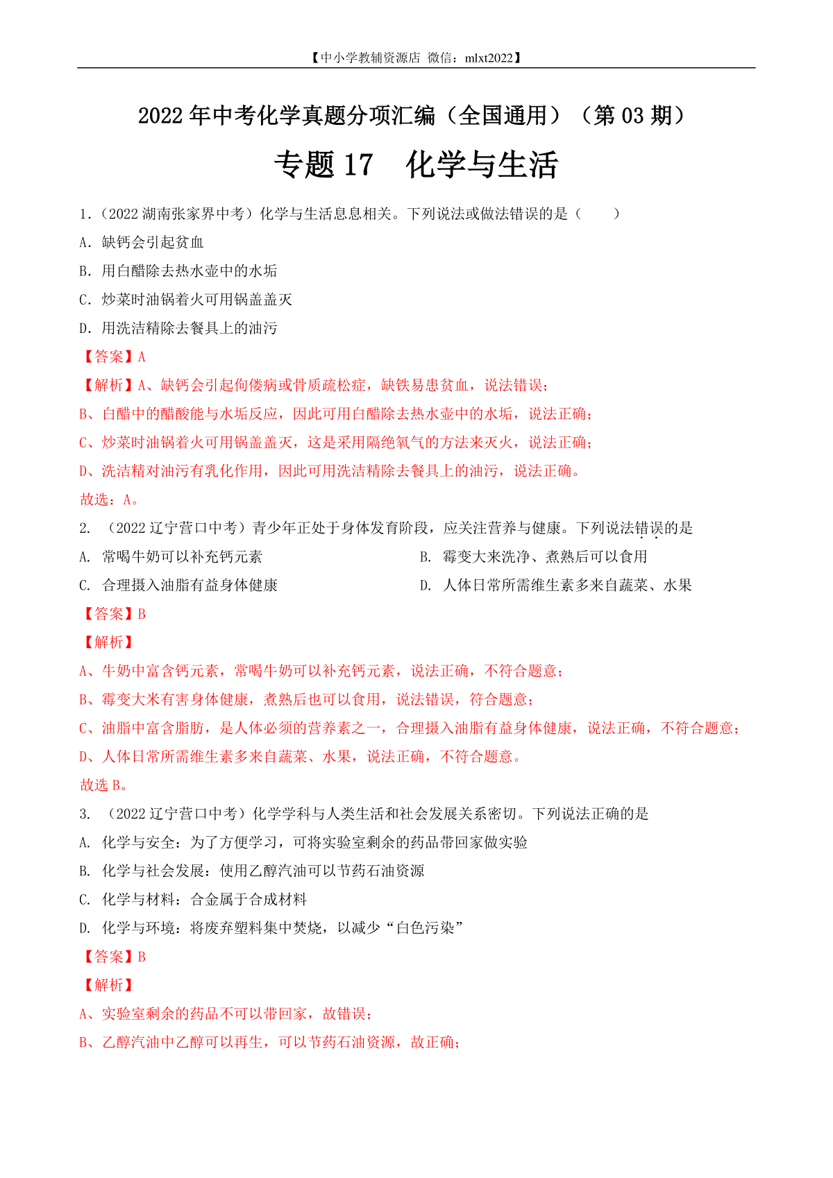 如果你想下载专题17 化学与生活-2022年中考化学真题分项汇编(全国通用)(第03期)(解析版)DOC或PDF版,请点击本文末链接!