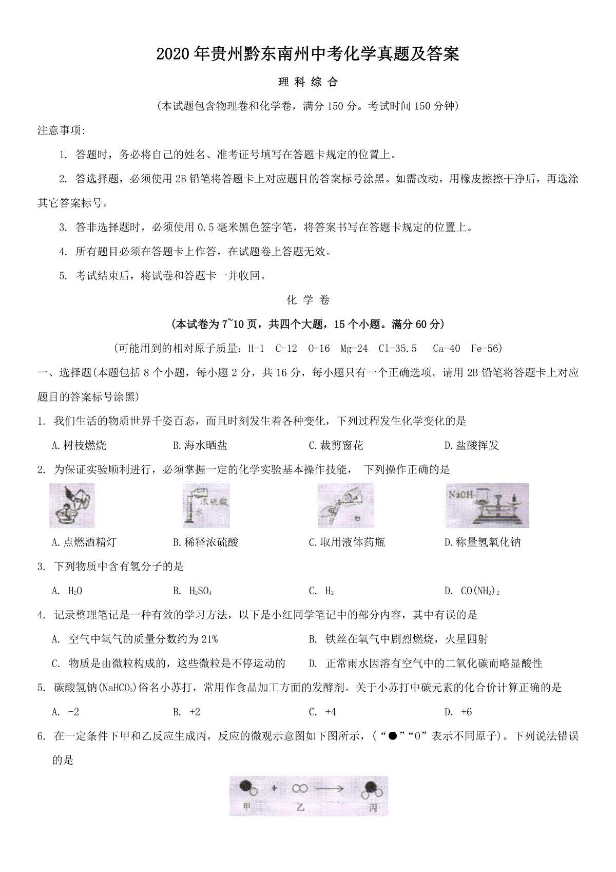 一、2020年贵州黔东南州中考化学真题及答案