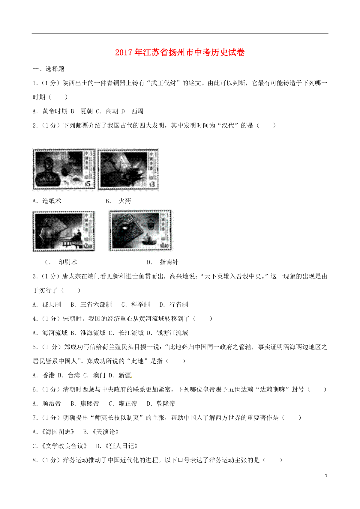 一、江苏省扬州市2017年中考历史真题试题(含解析)