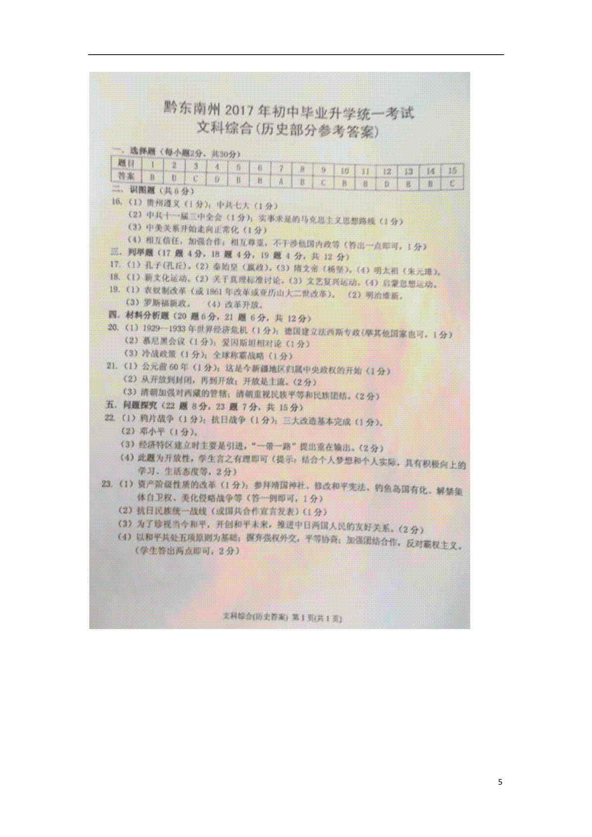 一、贵州省黔东南州2017年中考历史真题试题(扫描版,含答案)