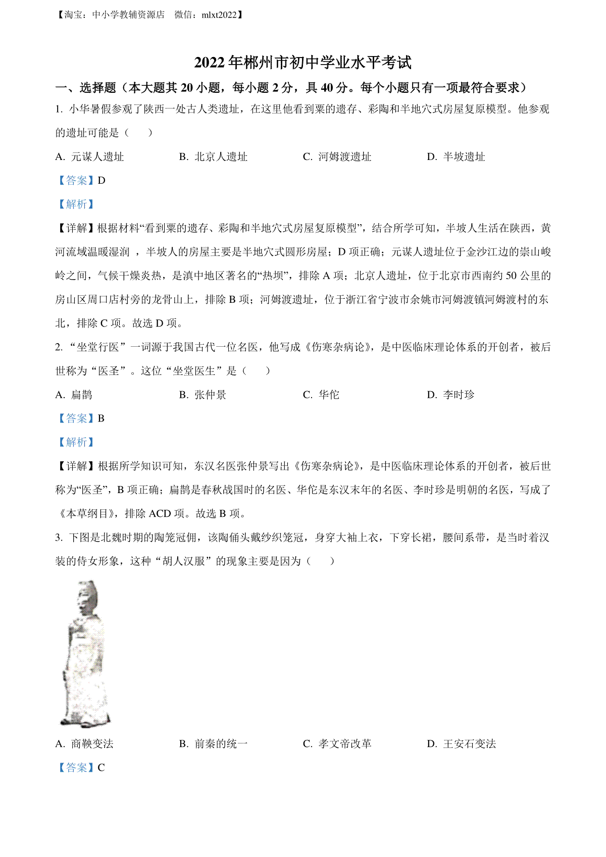 如果你想下载精品解析:2022年湖南省郴州市中考历史真题(解析版)DOC或PDF版,请点击本文末链接!