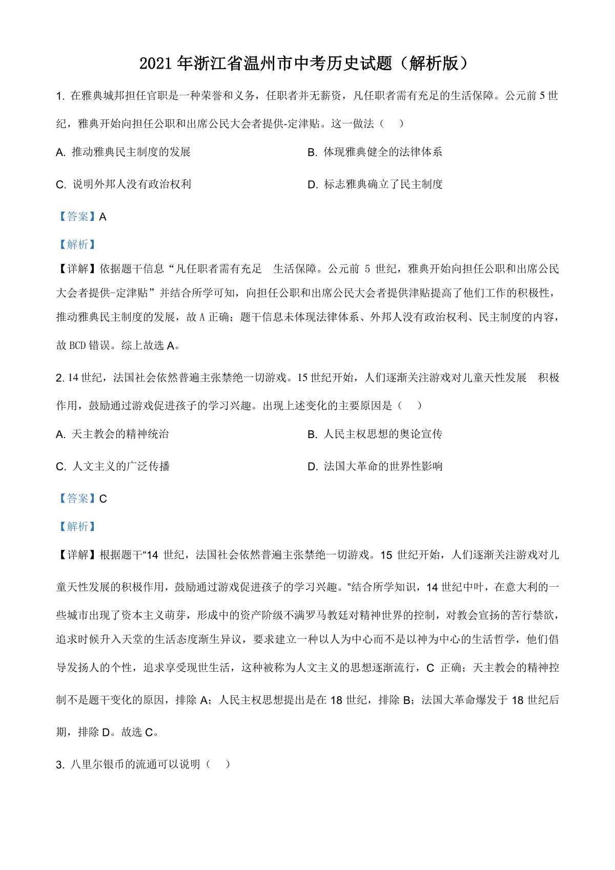 一、精品解析:2021年浙江省温州市中考历史试题(解析版)