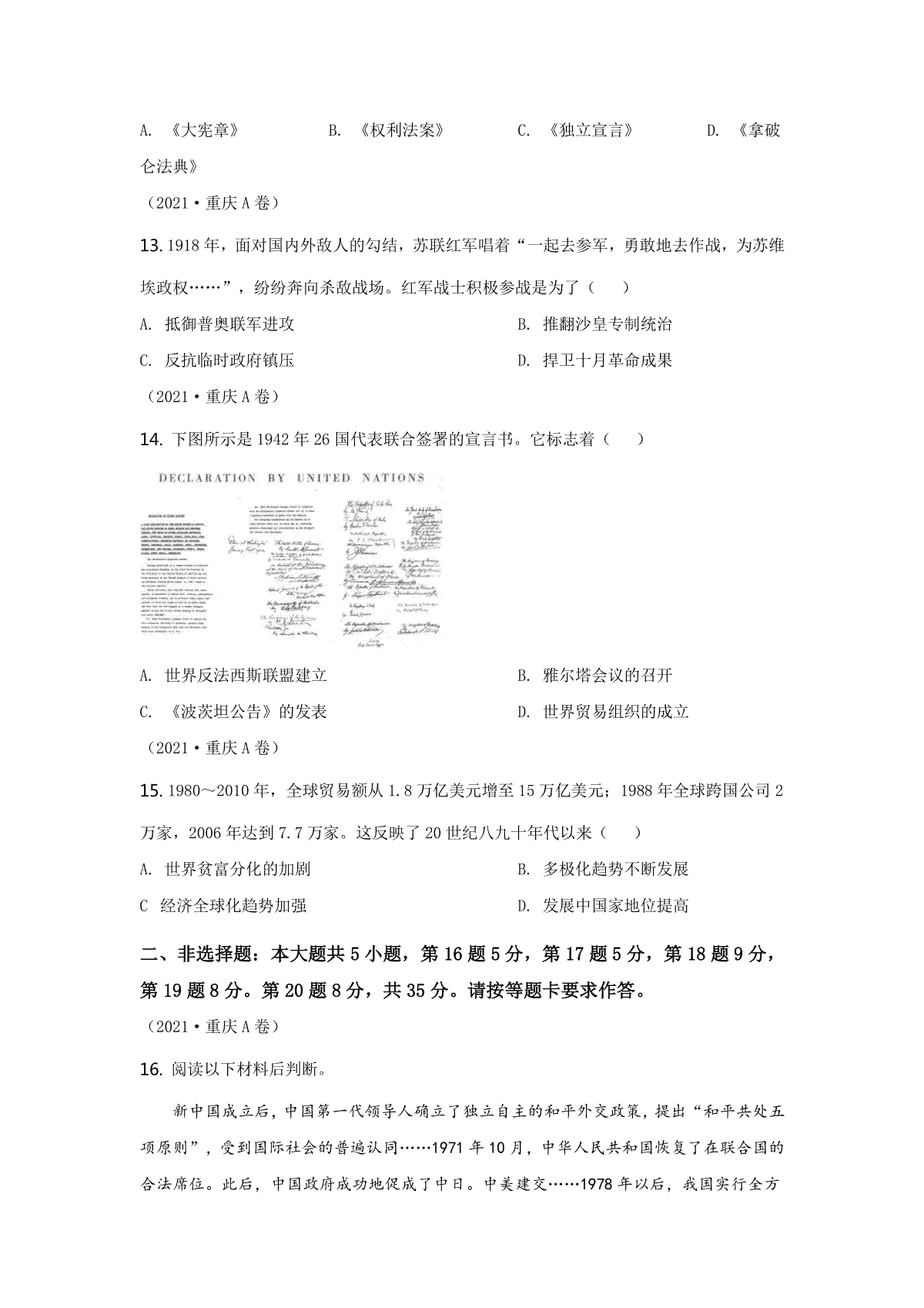 一、2021年重庆市中考历史A卷试卷(含答案)