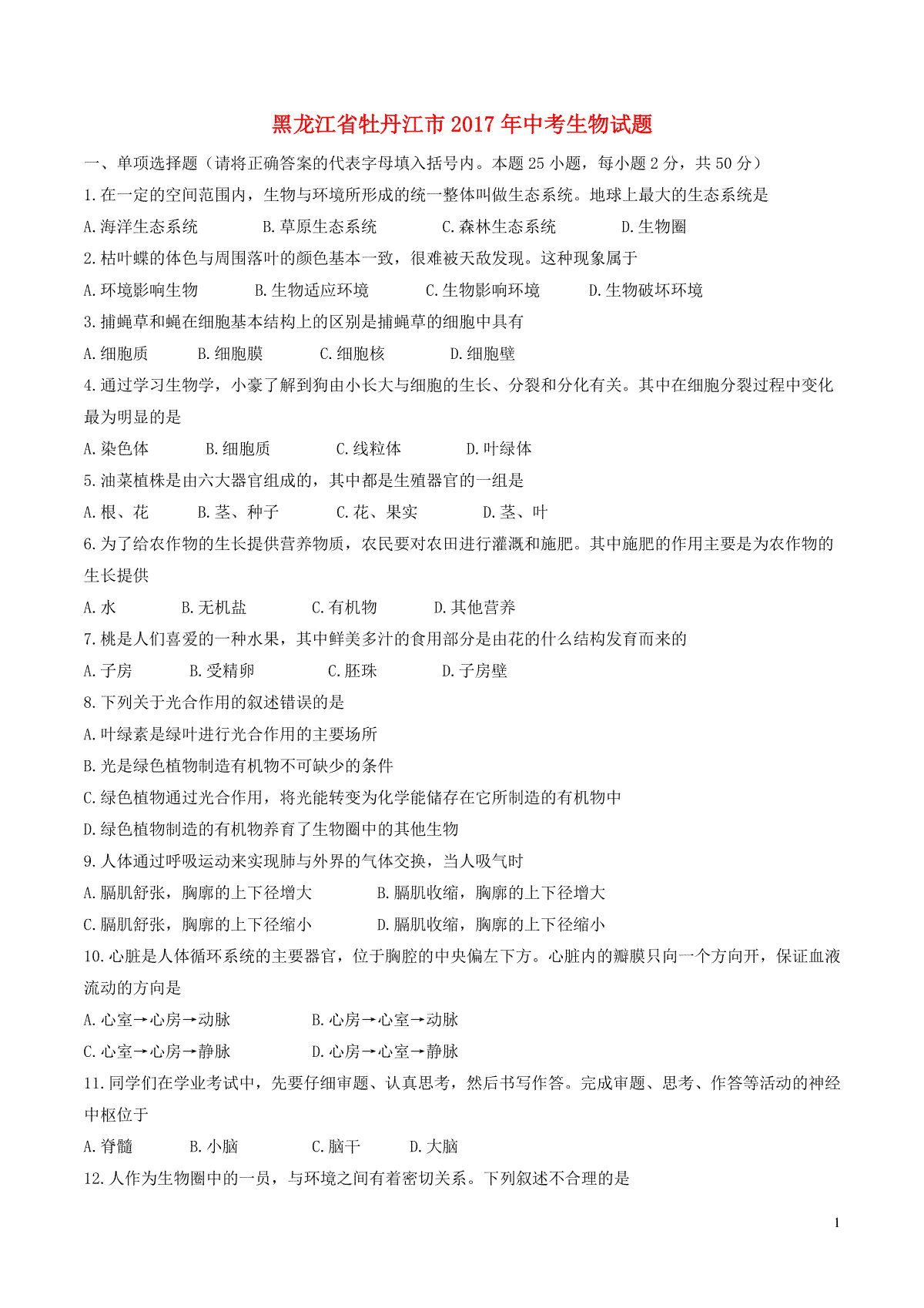 一、黑龙江省牡丹江市2017年中考生物真题试题(含答案)