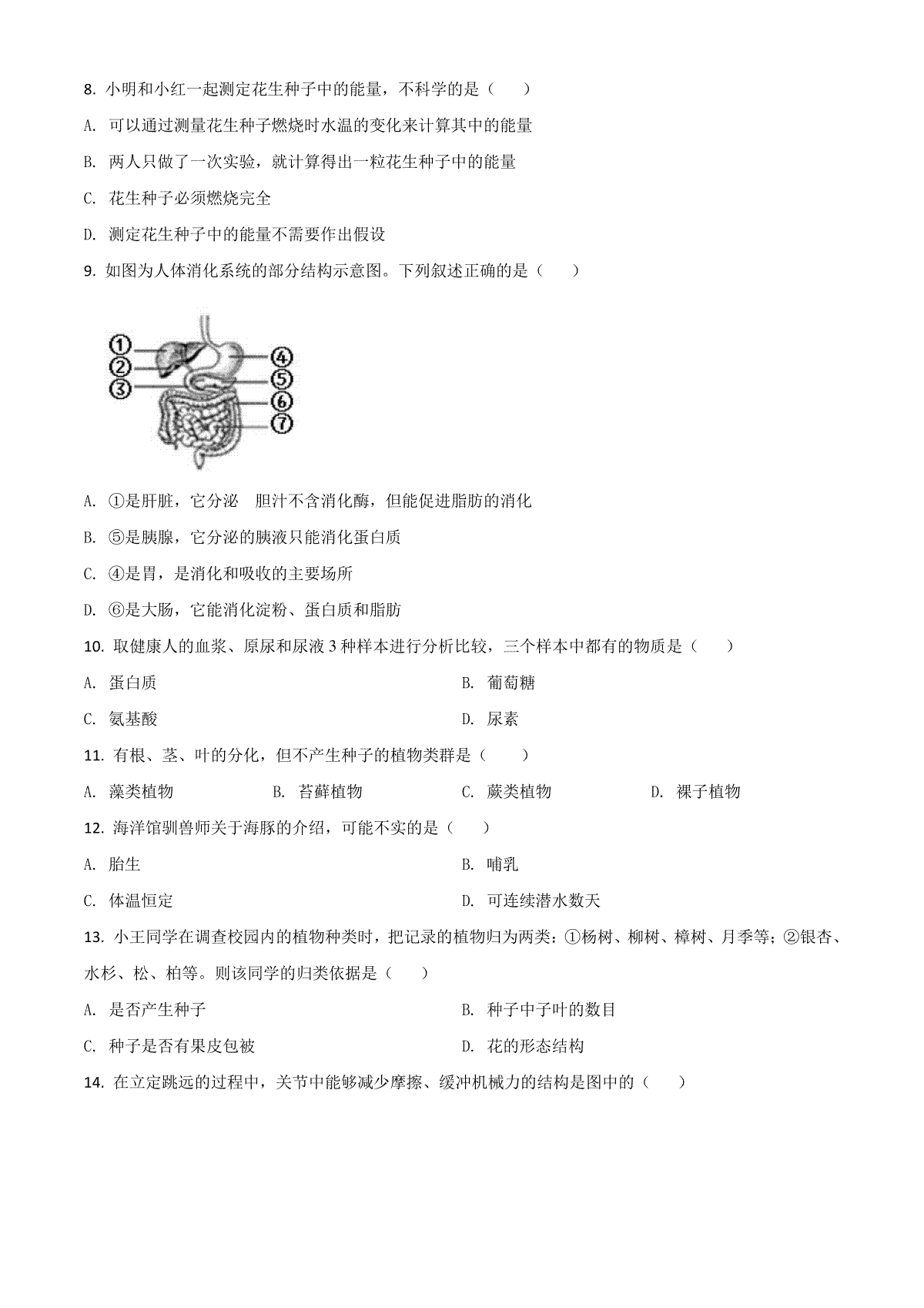 一、精品解析:湖南娄底市2020年中考生物试题(原卷版)