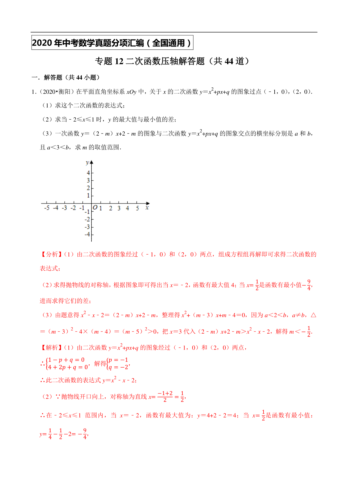 专题12二次函数压轴解答题(共44道)-2020年中考数学真题分项汇编(解析版)【全国通用】于近期开考,本次考试对考生对知识的掌握参考价值大,为了方便大家复习掌握错题!小编在下文为大家准备了专题12二次函数压轴解答题(共44道)-2020年中考数学真题分项汇编(解析版)【全国通用】试卷及答案解析详情,仅供考生参考。