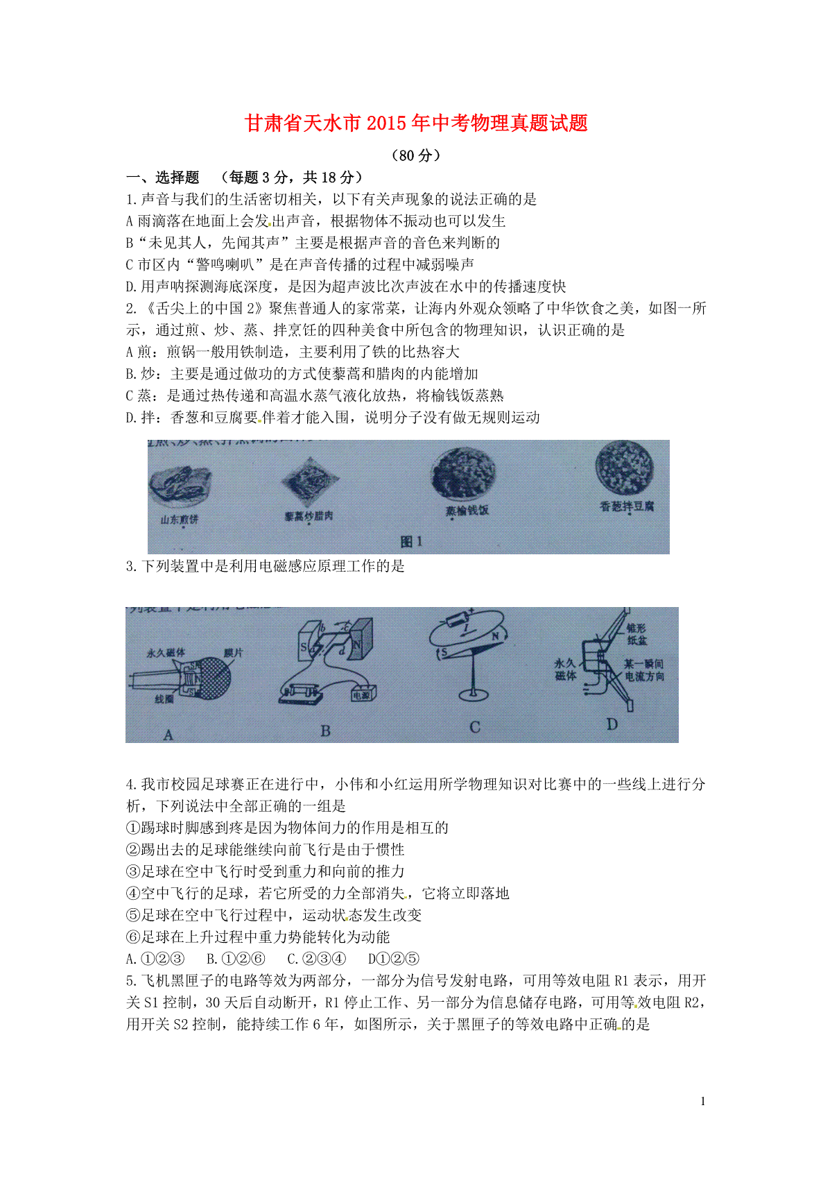 一、甘肃省天水市2015年中考物理真题试题(无答案)
