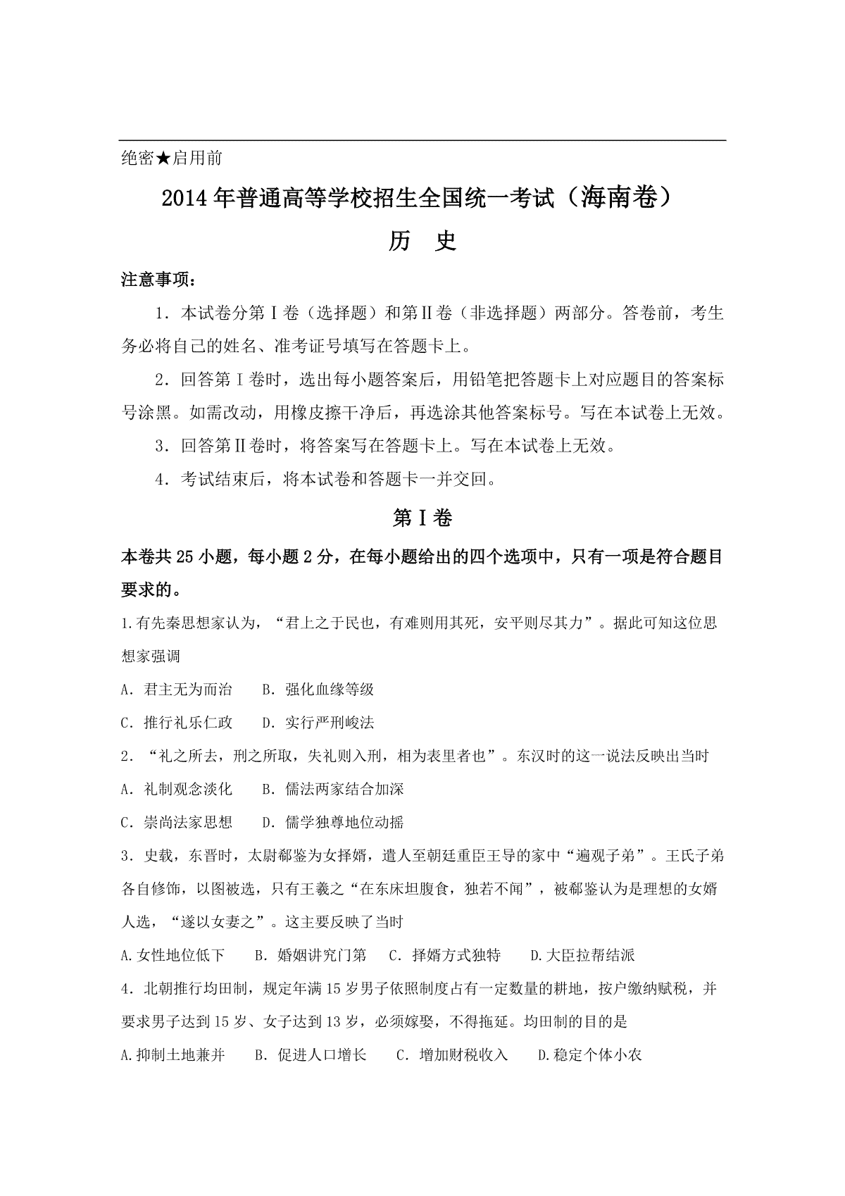一、2014高考海南卷历史(原卷版)
