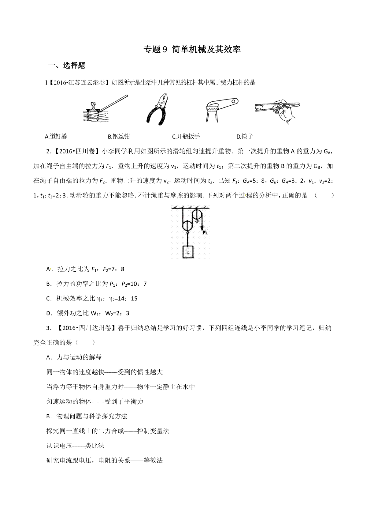 一、专题09 简单机械及其效率(第01期)-2016年中考物理试题分项版解析汇编系列(原卷版)1