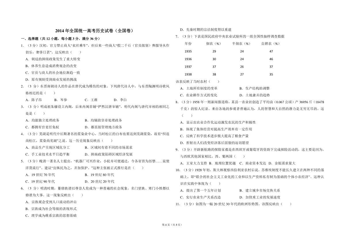 一、2014年全国统一高考历史试卷(全国卷)(原卷版)