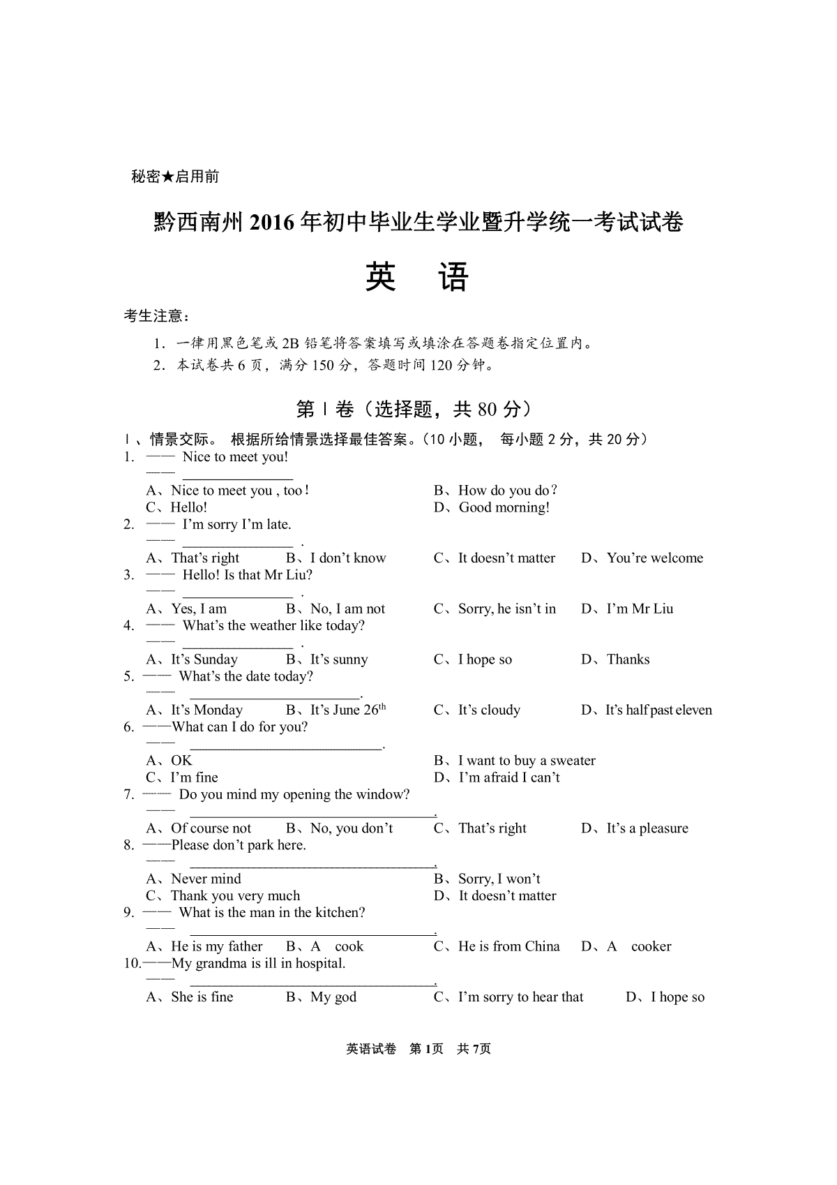 一、贵州省黔西南州2016年中考英语真题试题(pdf,含答案)