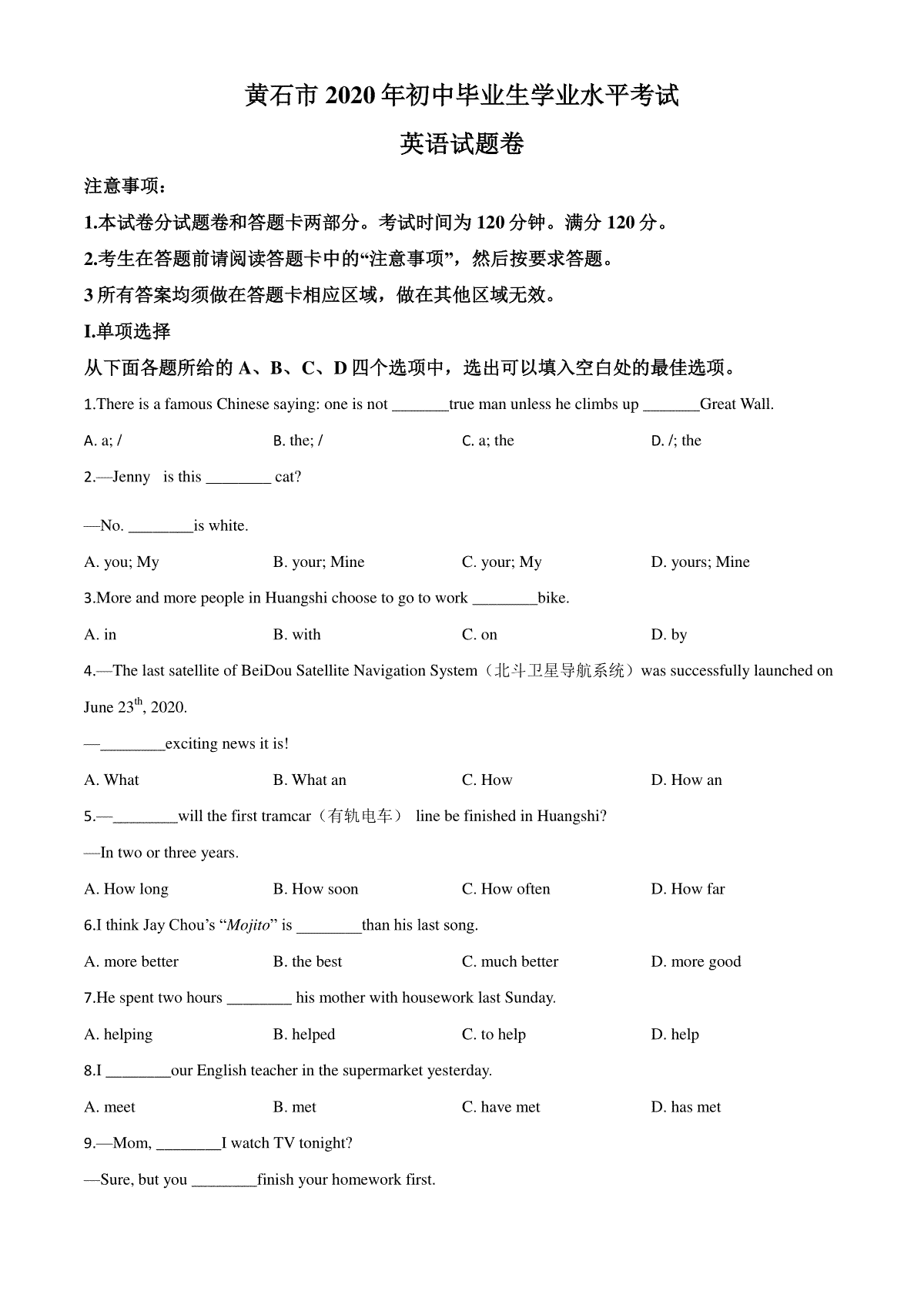一、精品解析:湖北省黄石市2020年中考英语试题(原卷版)