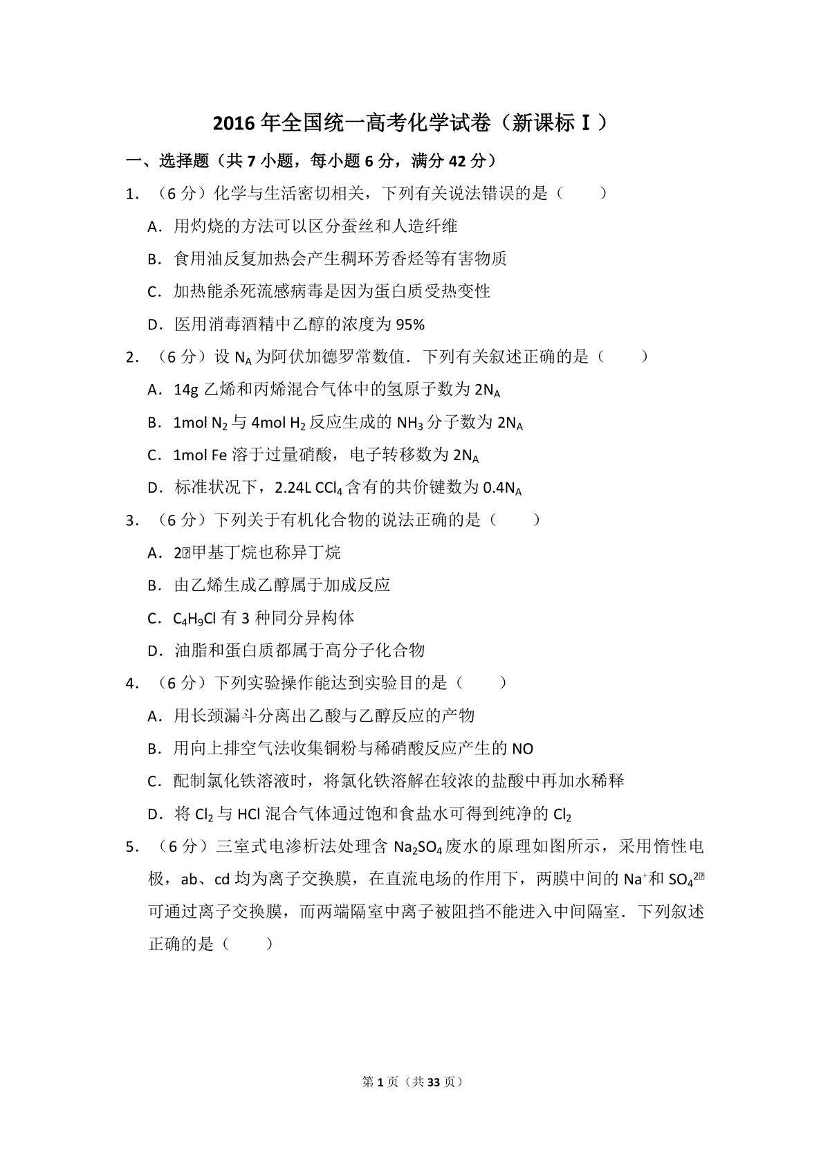 一、2016年全国统一高考化学试卷(新课标ⅰ)(含解析版)