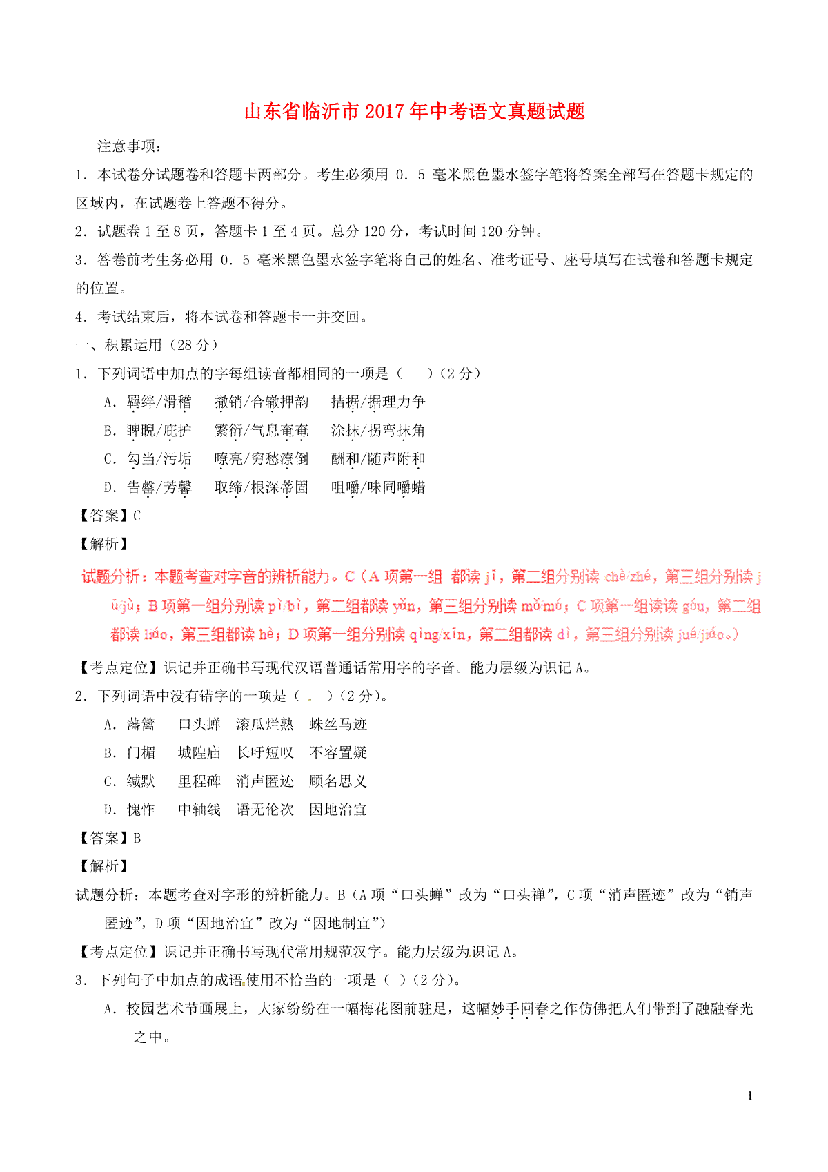 一、山东省临沂市2017年中考语文真题试题(含解析)